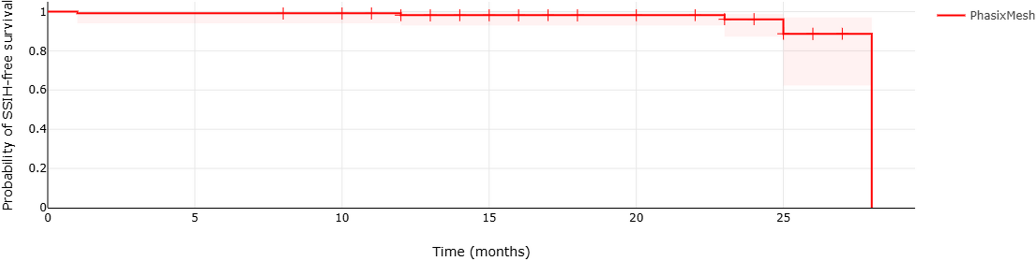 34] evaluated a faster-degrading (approximately 6 months) biosynthetic mesh (Bio-A, Gore) to prevent SSIH. The mesh was a copolymer of polyglycolic acid and trimethylene carbonate in a three-dimensional matrix, with a 1-year SSIH rate of 3.8%. In our study, the SSIH rate at 1 year was 1.7% after sublay Phasix™ mesh placement, which is lower than the rates reported for intraperitoneal (9%) and retromuscular (3.3%) biological meshes [