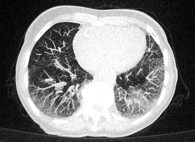 Low-dose-Computertomographie des Thorax. Bilaterale Milchglastrübungen und basale, subpleural betonte Retikulationen als Ausdruck einer interstitiellen Lungenerkrankung, radiologisch als „indeterminate UIP“ („usual interstitial pneumonia“) gewertet