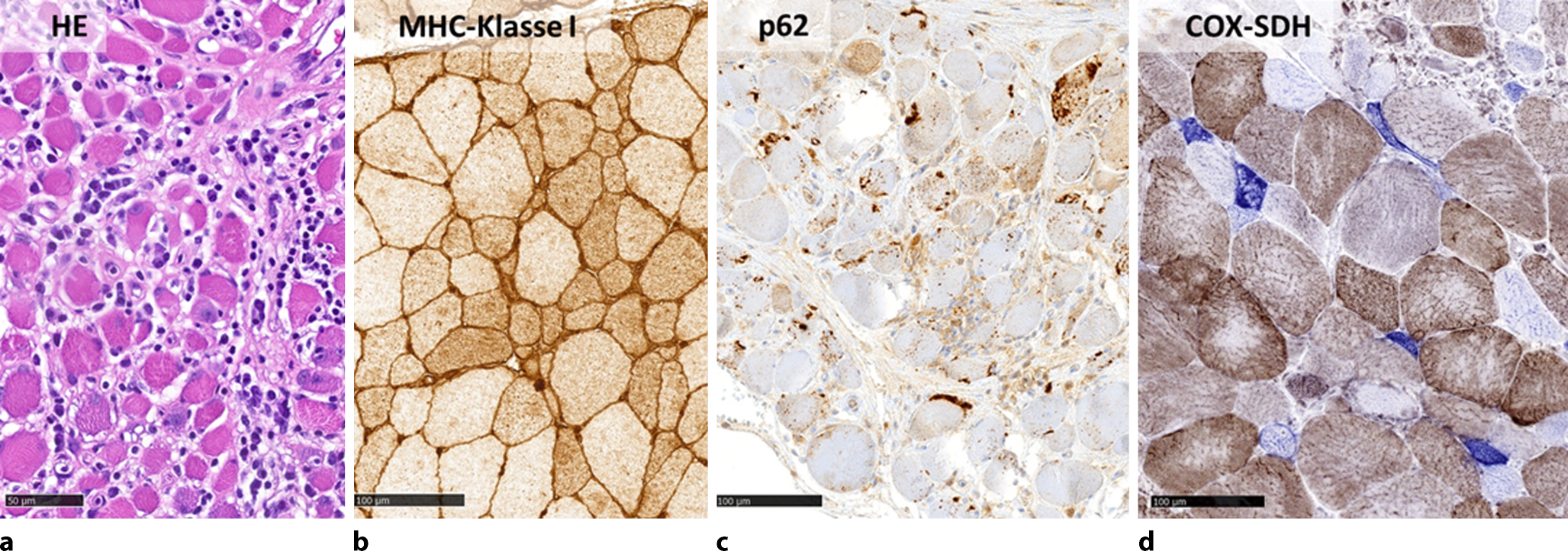 Histologie der Muskelbiopsie des M. vastus lateralis links. Histopathologisch finden sich ausgeprägte Infiltrate endomysial (a), welche sich immunhistochemisch vorrangig als T‑Zell-Infiltrate abbilden lassen (nicht abgebildet). Vakuolen finden sich nicht. Ferner stellt sich eine diffuse MHC-Klasse-I-Überexpression sarkolemmal und sarkoplasmatisch dar (b). Die p62-positiven Aggregate sind typischerweise bei IBM beschrieben ([19], c). Die mitochondriale Pathologie verdeutlicht sich insbesondere in der COX-SDH-Färbung, wo sich zahlreiche (über der Korrelation für den Altersdurchschnitt) COX-negative, SDH-positive Fasern darstellen (blau eingefärbt, d)