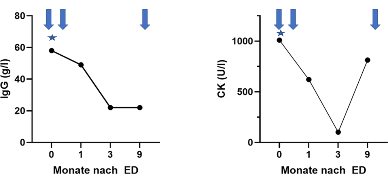 Aktivitätsparameter im Verlauf. Unter Therapie deutlicher Abfall von sowohl IgG (Monat 0: 56 g/l, Monat 1: 48,6 g/l, Monat 3: 22,8 g/L, Monat 9: 22,6 g/l) als auch CK. Parallel hierzu Anstieg des MMT‑8 von 113 (Monat 0) auf 134 (Monat 9) und eine Regredienz der Dysphagie. Neun Monate nach der letzten Rituximab-Gabe kam es unter niedrig dosiertem Prednisolon zu einem erneuten Anstieg der CK, weshalb aktuell eine Erhaltungstherapie mit Rituximab erfolgt. Die Pfeile markieren die Rituximab-Gaben. Der Stern die Immunglobulingabe (1-malig 100 g)