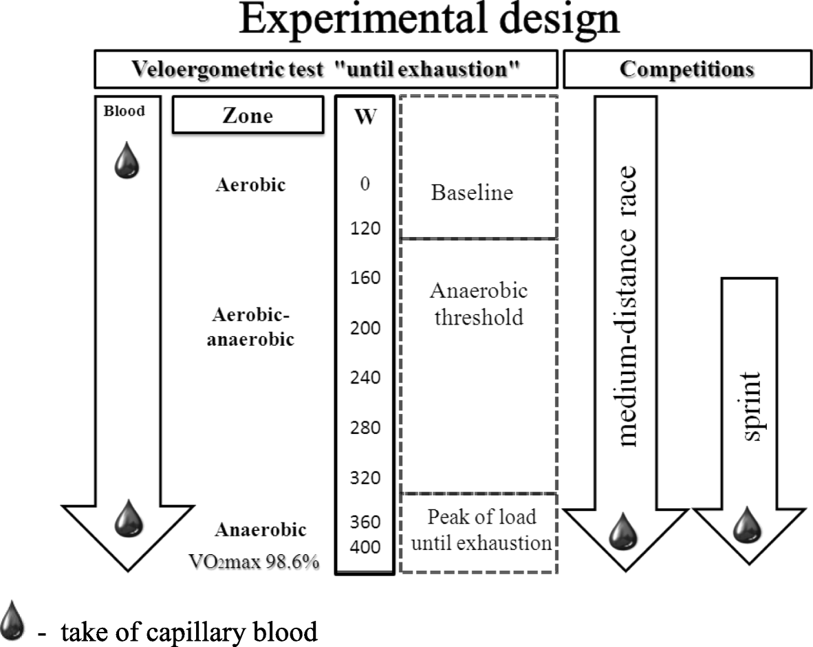 The athletes performed veloergometer test until exhaustion in June 2014 during training period. Later, in November 2014 during they participated in 1.3-km ski race (sprint, high intensity exercise), and on the next day they participated in a 15-km (medium distance, medium intensity exercise) race (both in classical cross-country style) by Russian Cross-Country Skiing Cup.