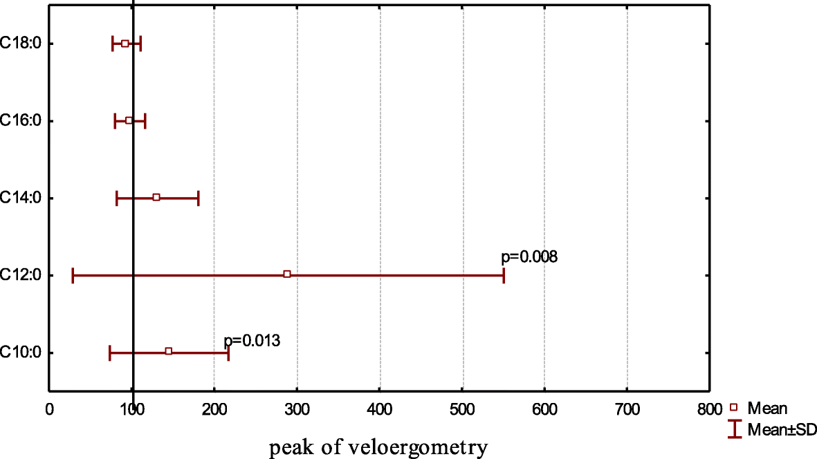 After ergometric exercise, the average value of the total FA pool was 1.44 ± 0.25 mg/ml. No significant differences in total FAs were found between rest and peak load (p = 0.808). Analysis of the saturated FA profile of the skiers revealed a significant increase in the level of capric acid (C10:0) (p = 0.013), twice as much as the increase in lauric acid (C12:0) (p = 0.008) relative to baseline (Fig. 2).