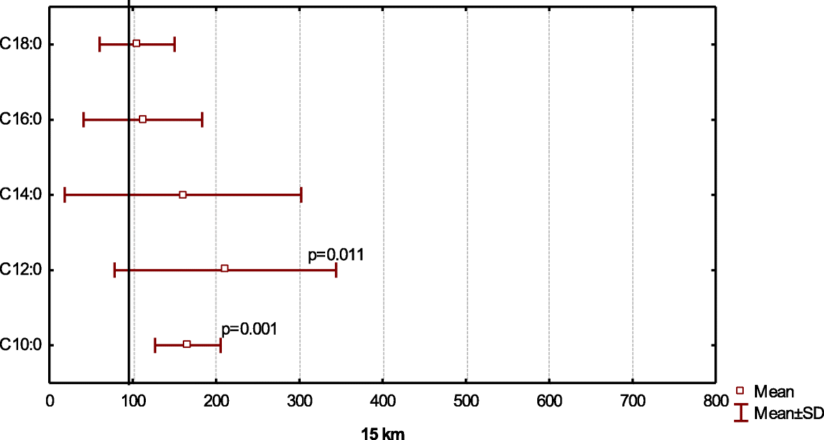 After a short-distance race (1.3 km), the percentage of capric acid increased from 0.17 to 0.28% (p = 0.001), similar to the increase after 15 km (p = 0.001) (Figs. 3, and 4). We also observed a two-fold increase in lauric acid (С12:0) content after 1.3-km (p = 0.004) and 15-km (p = 0.011) races. Furthermore, myristic acid (C14:0) concentrations increase 30% (p = 0.119) and 70% (p = 0.054) relative to baseline values after 1.3 km and 15 km, respectively. No significant differences in the concentrations of palmitic acid (С16:0) or stearic acid (С18:0) were after a short (p = 0.219; p = 0.136) or medium distance (p = 0.612; p = 0.772).