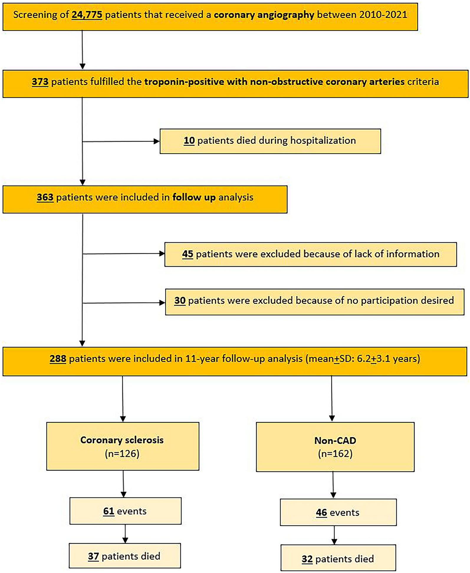 Therefore, the objective of this study was to assess the prognostic implications of coronary sclerosis in troponin-positive patients with non-obstructive coronary arteries, focusing on both in-hospital and out-of-hospital events, as well as long-term outcomes, including mortality.
