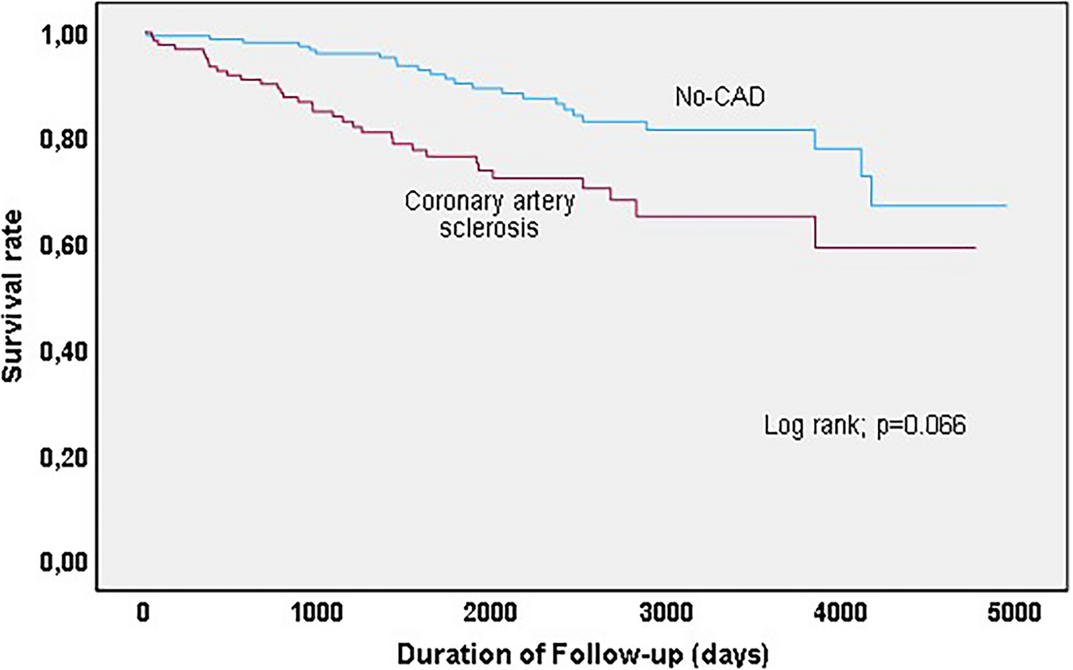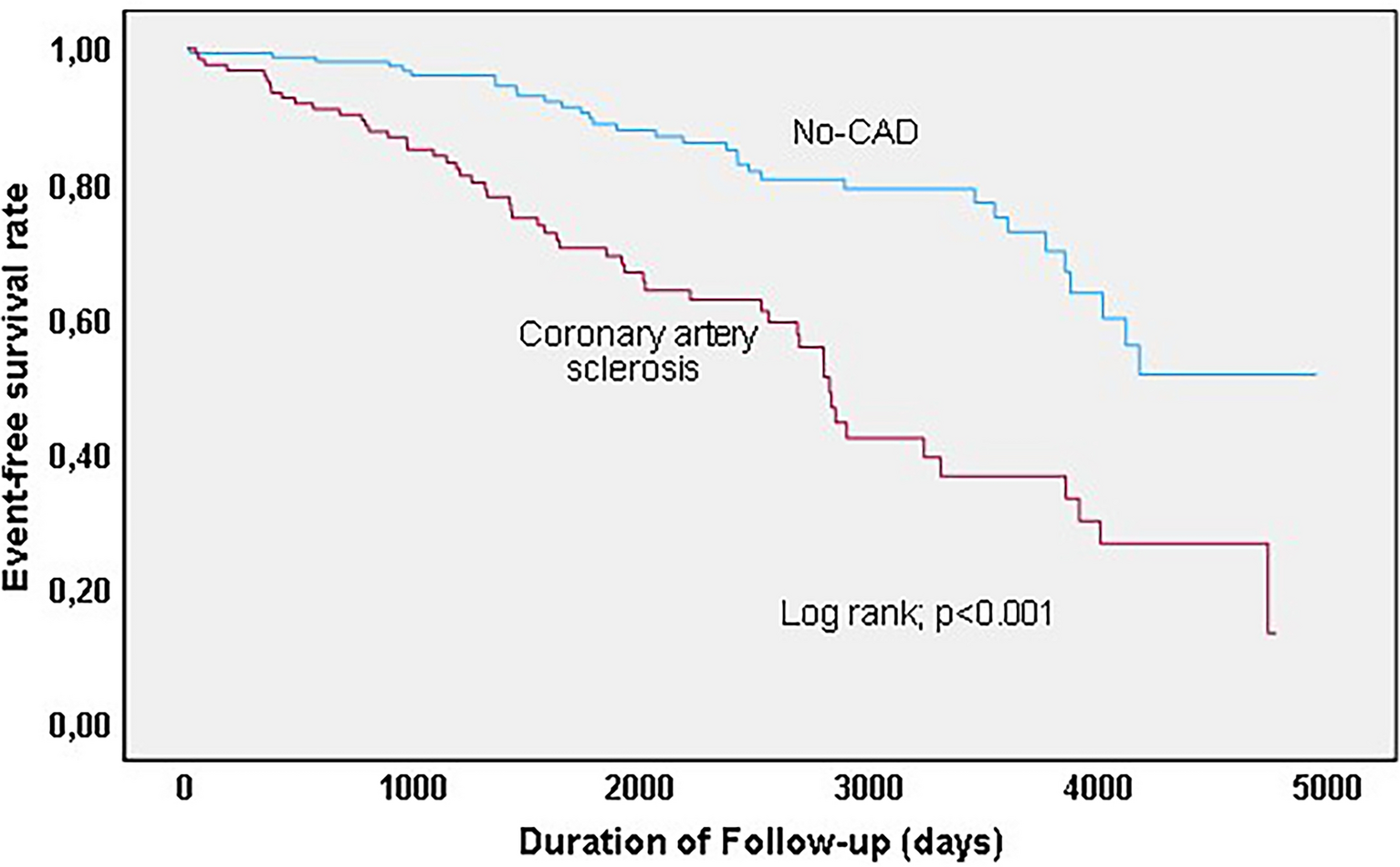 The statistical analysis was conducted using SPSS Statistics 23.0 software. Continuous variables with a normal distribution were expressed as mean ± standard deviation, while those with a non-normal distribution were presented as median (interquartile range). Categorical variables were reported as numbers and relative frequencies (%). The normality of continuous variables was assessed using the Kolmogorov–Smirnov test. Comparison between continuous variables with normal and non-normal distributions was performed using either Student's t-test for independent samples or the Mann–Whitney U test. Categorical variables were compared using either the chi-square test or Fisher's exact test. The prognostic impact of coronary artery sclerosis on the outcome was assessed through Kaplan–Meier analyses. Cox regression analysis was conducted to identify independent predictors of in- and out-of-hospital events. A significance level of p < 0.05 was considered statistically significant, and all reported probability values are two-sided.