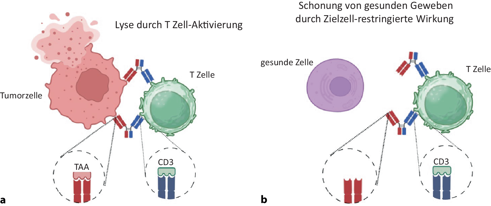 Antikörper kamen erstmals in Form von humanisierten monoklonalen Antikörpern (mAbs) in der Krebstherapie zum Einsatz. Ihre therapeutische Wirkung beruht wesentlich auf der Stimulation Fc-Rezeptor-tragender Immuneffektorzellen, was zur Lyse der Tumorzellen insbesondere durch Natürliche Killer (NK)-Zellen führt. Eine Stimulation von T‑Zellen ist mit mAbs jedoch nicht möglich, da T‑Zellen in der Regel keine Fc-Rezeptoren exprimieren. Eine Rekrutierung von T‑Zellen kann jedoch mit bsAbs erreicht werden, die mit ihrem Ziel-Arm an ein tumorassoziiertes Antigen (TAA) binden und mit ihrem Effektorarm üblicherweise durch Aktivierung des TCR/CD3-Komplex-T-Zellen stimulieren (Abb. 1a). Mittlerweile wurde eine Vielzahl verschiedener bsAb-Konstrukte entwickelt, die sich in zentralen Charakteristika, also hinsichtlich ihrer Formate, Zielantigenbinder und Effektorkomponenten voneinander unterscheiden [3]. Von wesentlicher Bedeutung ist es in jedem Fall, eine unspezifische Aktivierung des T‑Zell-Systems durch fehlende Zielzellrestriktion zu vermeiden, d. h. ungerichtete T‑Zell-Aktivierung, ohne dass der bsAb an eine Tumorzelle gebunden ist, auszuschließen. Aber auch eine übermäßige „On-target-off-tumor“-Aktivierung von T‑Zellen, z. B. durch Expression der Zielantigene auf normalem Gewebe, kann zu lebensbedrohlichem Zytokin-Release-Syndrom (CRS) führen und auch in weniger ausgeprägten Fällen die Applikation höherer Dosierungen mit optimaler antitumoraler Wirksamkeit verhindern. Vor diesem Hintergrund sollte nicht nur das Zielantigen möglichst wenig auf gesunden Zellen exprimiert werden (Abb. 1b); es muss auch die Bindung des bsAbs an Fc-Rezeptor-tragende Zellen vermieden werden, da dies auch in Abwesenheit von Tumorzellen zur Aktivierung von T‑Zellen führen kann.