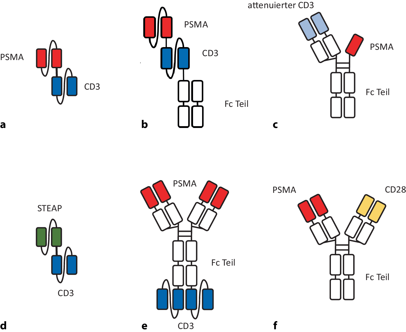 Pasotuxizumab/BAY 2010112/AMG 212 ist ein bsAb im Format eines sog. „bispecific T cell engager“ (BiTE), bei dem die variablen Domänen zweier Antikörper miteinander verbunden sind (Abb. 2a). Diese Struktur geht mit entsprechend kurzer Halbwertszeit einher. Der Antikörper wurde in einer Phase-I-Studie bei Patienten mit mCRPC getestet. Die maximal verträgliche Dosis konnte aufgrund eines vorzeitigen Studienabbruchs nicht definiert werden, die Entwicklung des Präparats wurde daher abgebrochen [13].