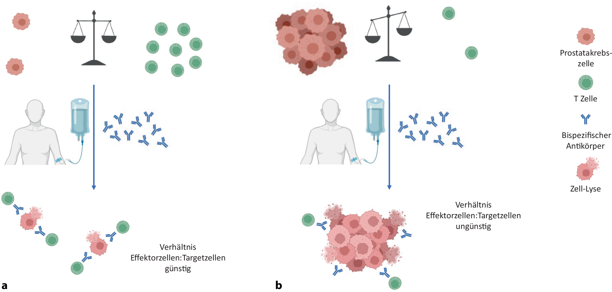 Verhältnis von Effektorzellen (T-Zellen) und Targetzellen (Tumorzellen) in Abhängigkeit vom Tumorstadium. a Wenig Tumormasse, z.B. biochemisches Rezidiv. b hohe Tumormasse, fortgeschrittene Erkrankungssituation
