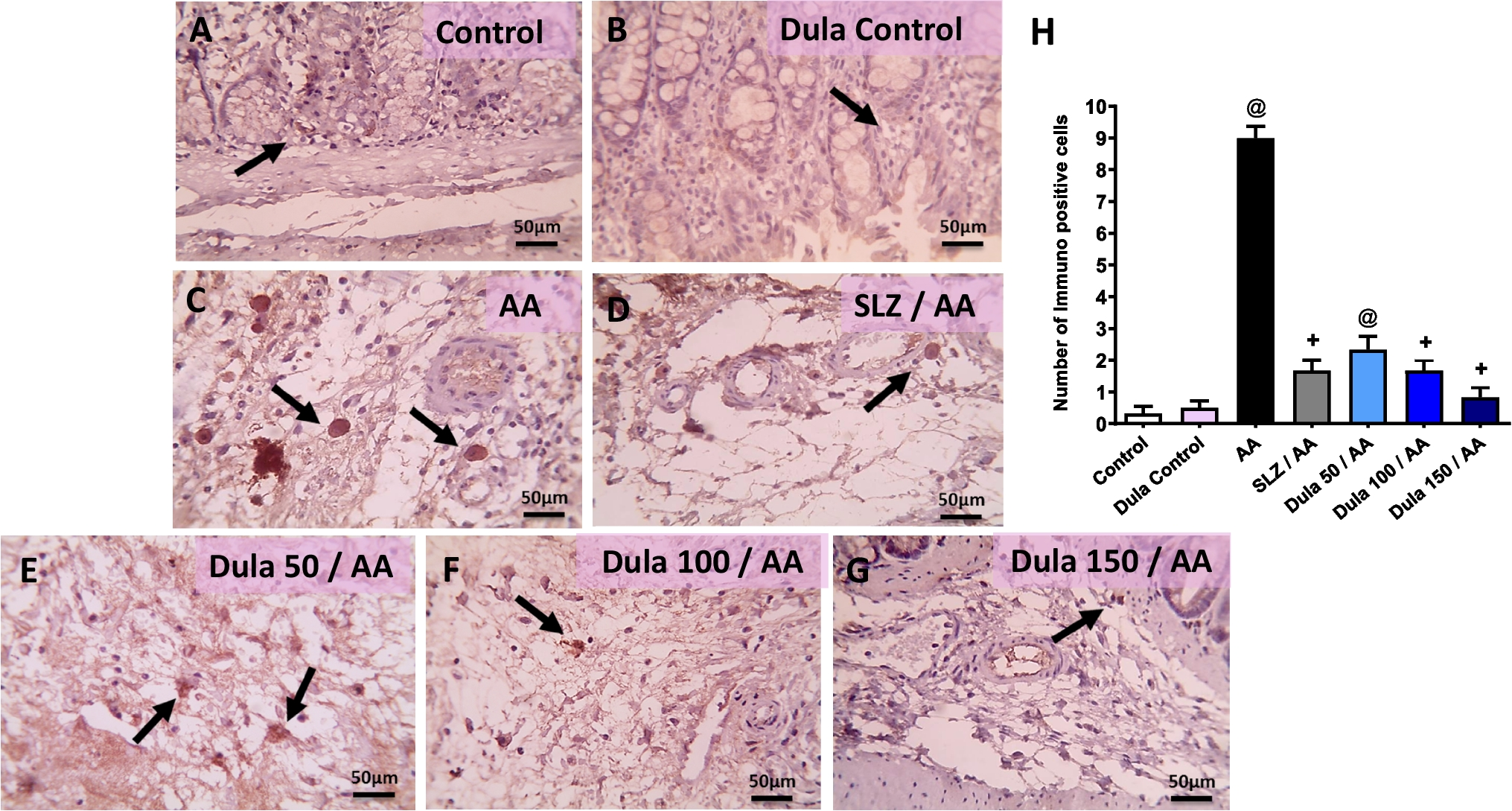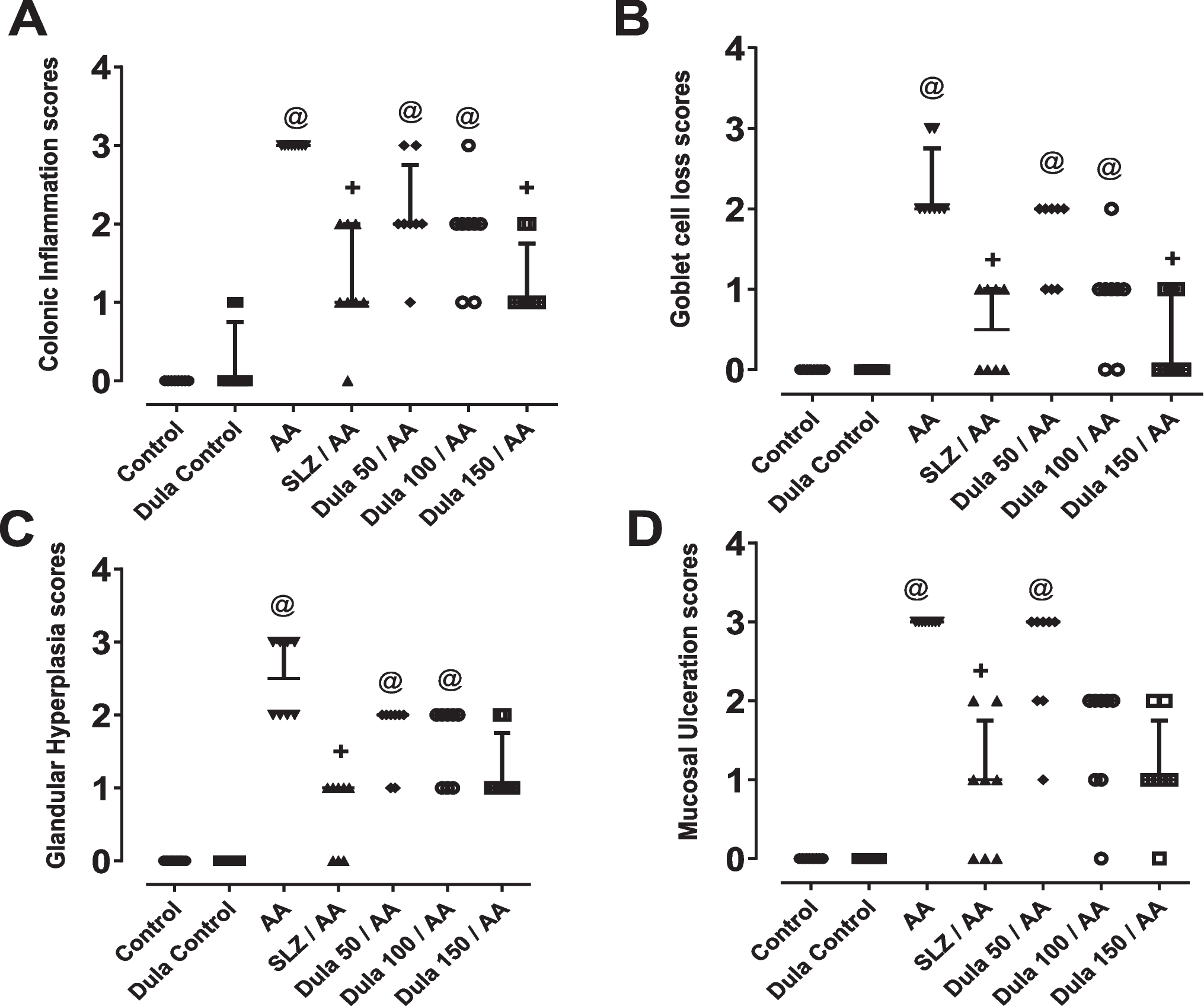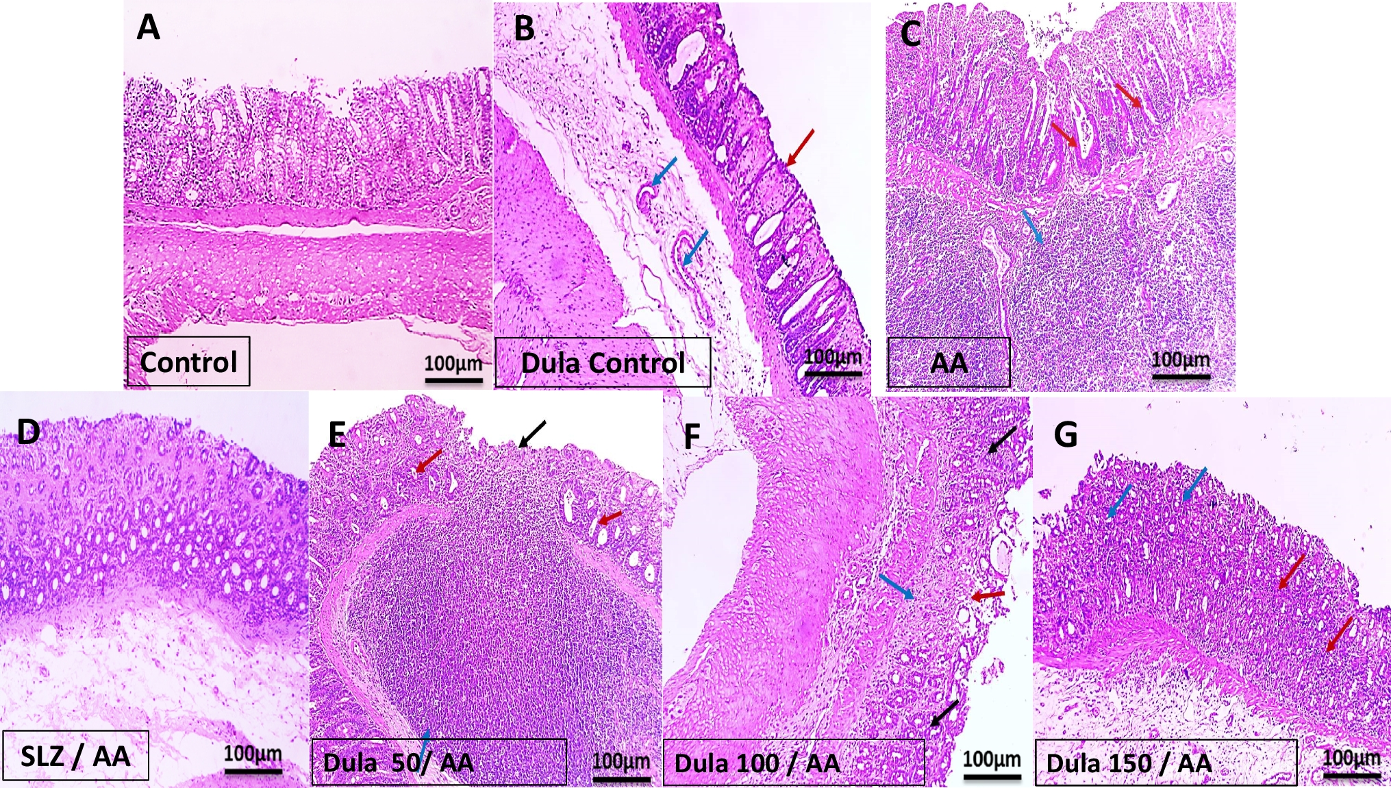 The effectiveness of Dula at 50, 100, and 150 μg/kg on the colon’s histological alterations