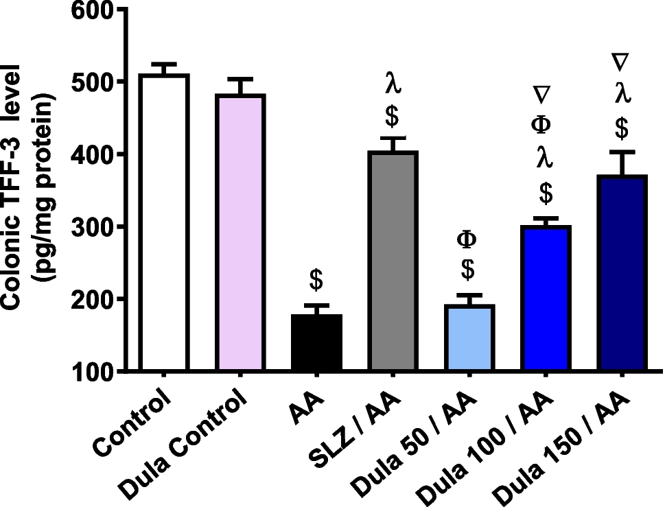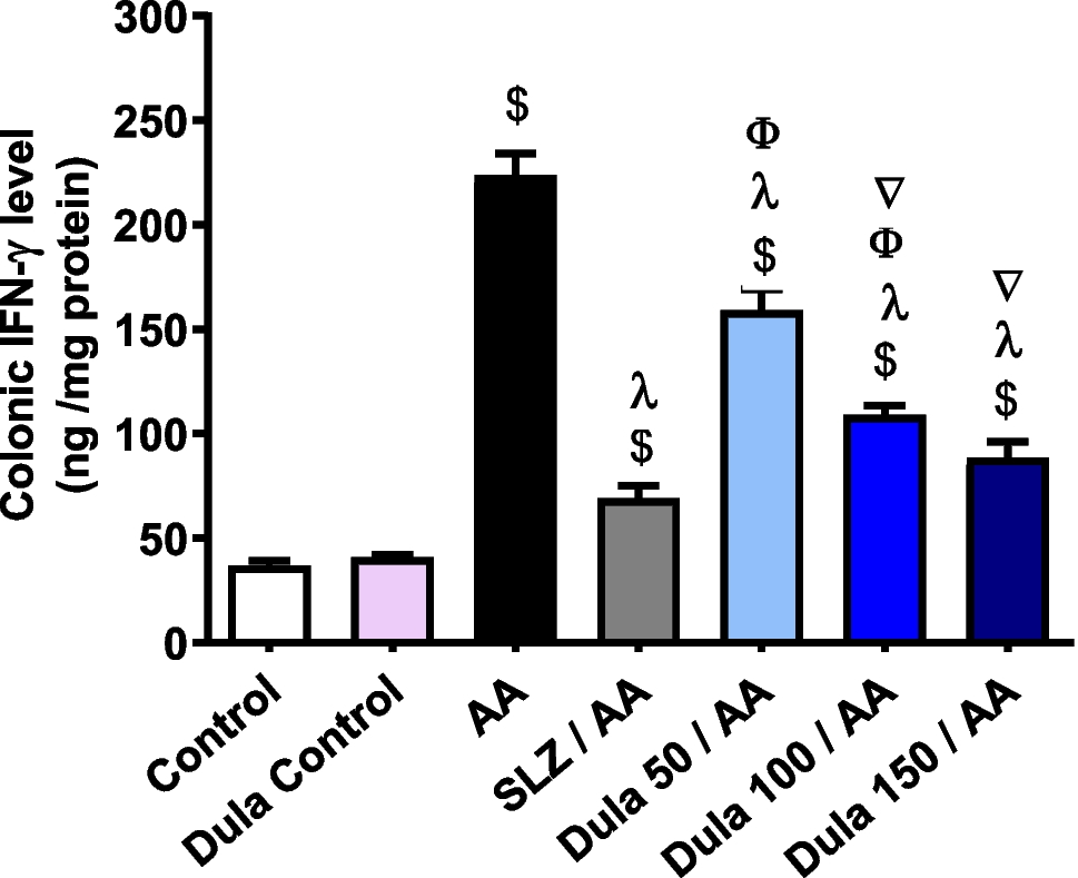Table 1 confirms that AA inoculation into the rectum augmented wet weight and weight/length by 1.40 times (p < 0.05) in comparison to the control group. Compared to the AA group, SLZ pretreatment animals experienced a significant (p < 0.05) fall in these indicators (by 22.95%). Rats getting 50, 100, and 150 μg/kg of Dula pretreatment revealed considerable (p < 0.05) drops in each parameter contrasted to the AA-treated group, with falls of 5.4%, 16.3%, and 21.06%, correspondingly.