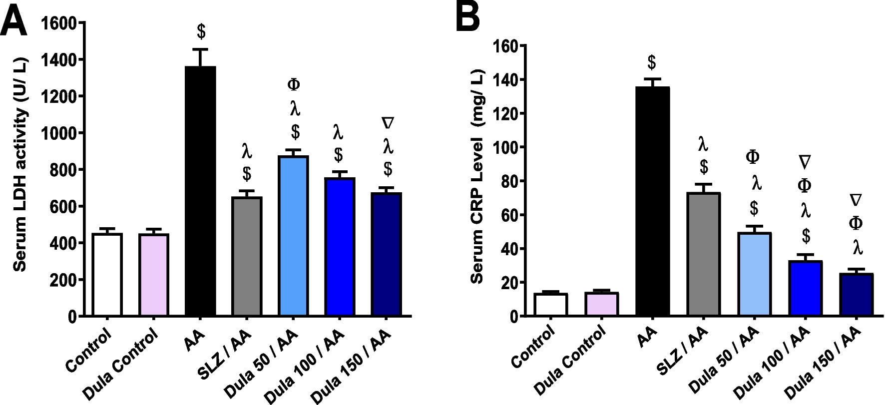 $,λ,ϕ,∇p<0.05, significantly different from the control group, AA-injected group, SLZ-treated group, and Dula 50 μg/kg-injected group, respectively, using one-way ANOVA followed by Tukey-Kramer multiple comparisons post hoc test