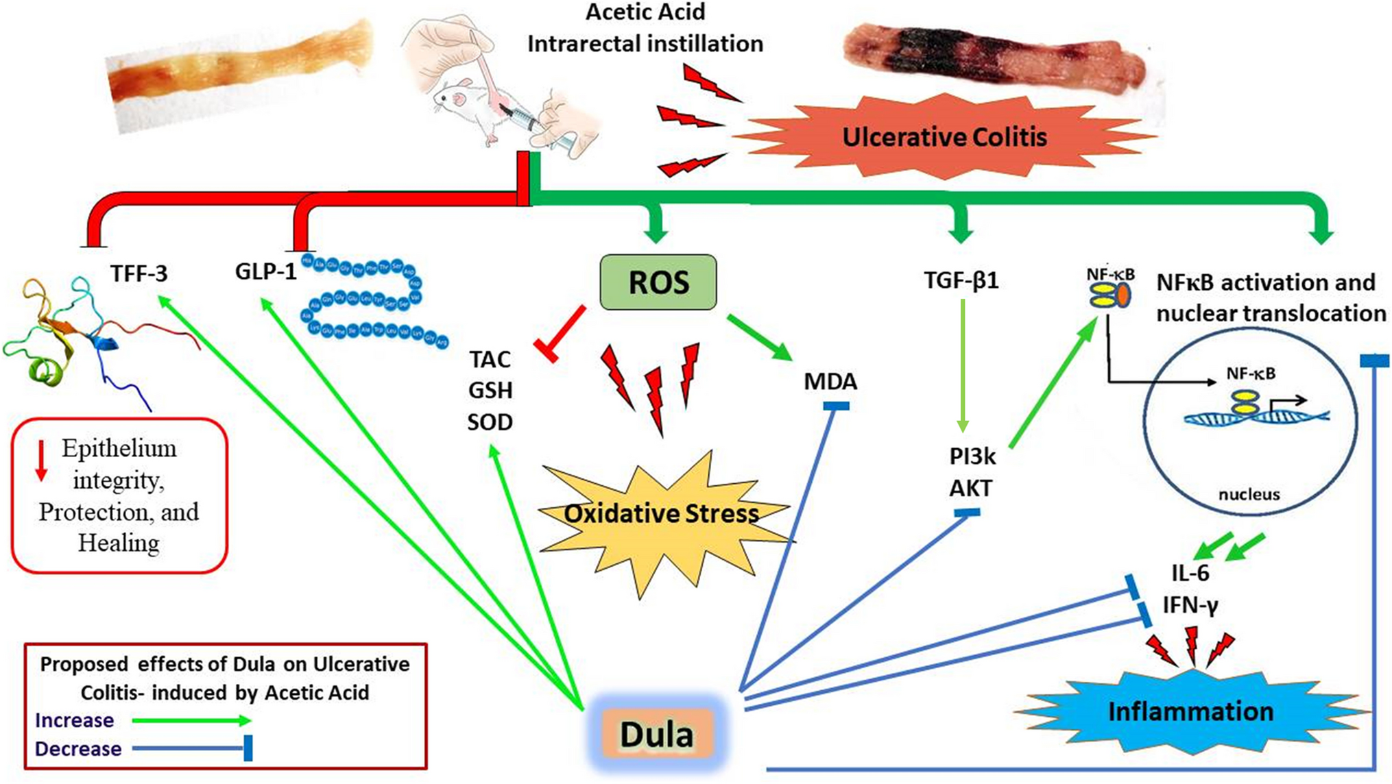 Dula, a GLP-1 agonist, may shield rats from AA-induced colitis. Pretreatment with Dula protected against AA-induced UC by decreasing colon mass index, colon weight and weight/length ratio, colonic macroscopic damage, and Dula also showed the ability to reduce oxidative stress damage via decreasing the lipid peroxidation end product, MDA, and restoring the decreased GSH, SOD, and TAC levels. Additionally, Dula managed to downregulate the inflammatory signaling pathway that involves TGF-β1/PI3K/AKT/NF-κB levels in the colonic homogenates and raised the expression of TFF-3 and GLP-1, all of which contribute to a better intestinal barrier. Nevertheless, further studies are needed to assess the safety, tolerability, and clinical effectiveness of Dula in therapy and focus on intestinal mucosal healing.