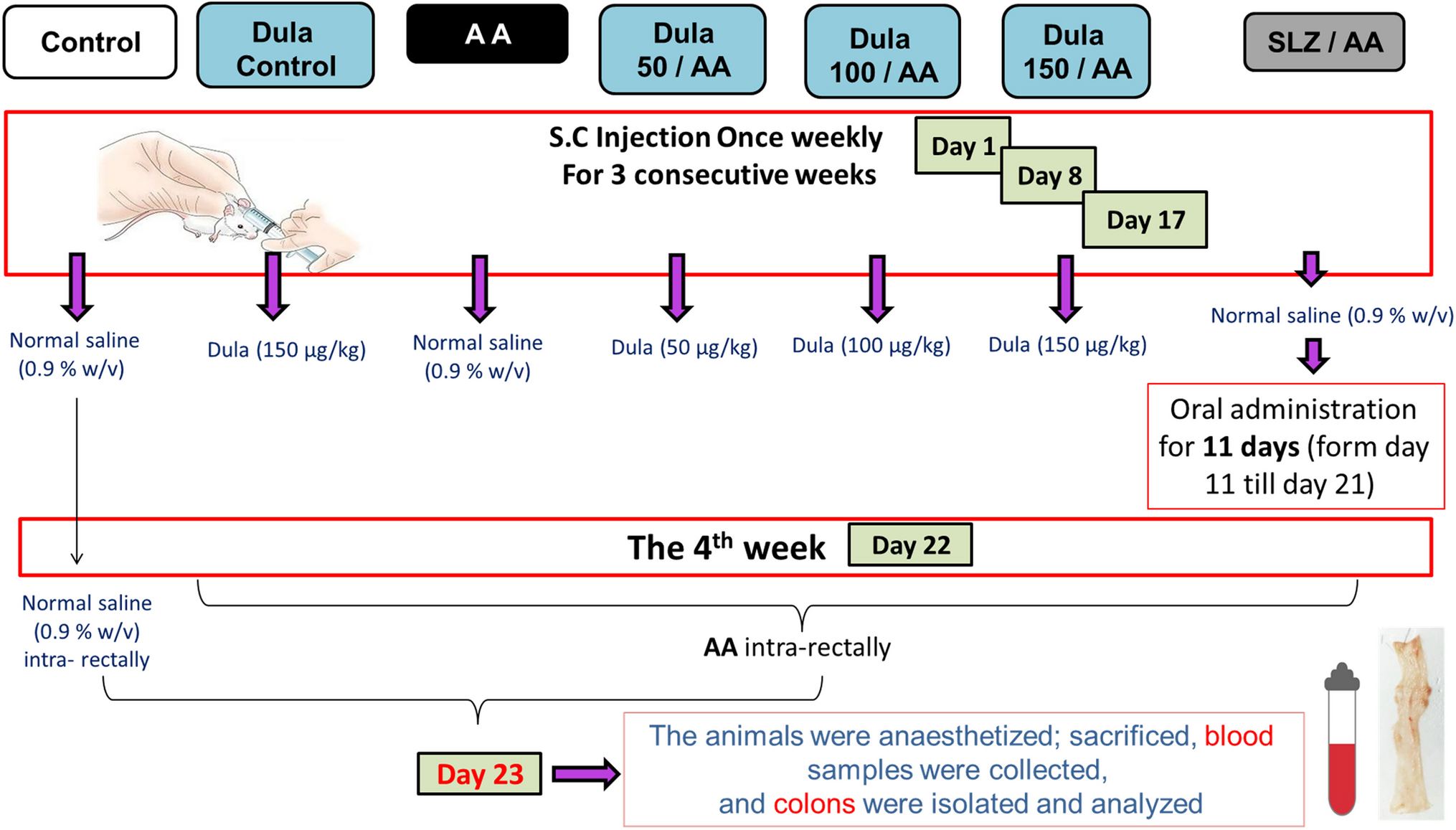 The Dula 50 μg/kg + AA group served as the treatment group; this group of rats got Dula (50 μg/kg, s.c.) once per week for three weeks in succession. On the fourth week (day 22), AA was added intrarectally (Wu et al. 2021).
