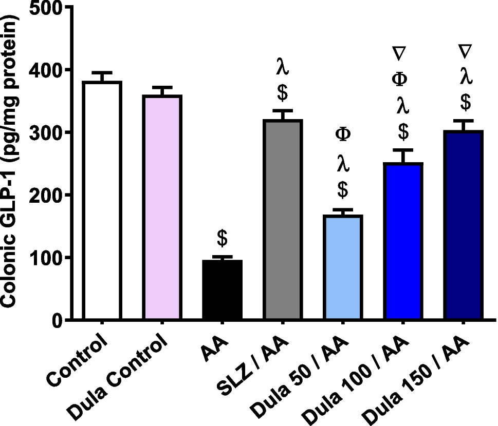 According to Zatorski et al.’s (Zatorski et al. 2021) study, acute inflammation in mouse models of colitis might cause harm to the colon mucosa and the EEC, which led to the lowering of total GLP-1 levels. Our investigation found that the GLP-1 level dropped in the AA group. As Dula is a structurally modified GLP-1 analogue with a longer half-life (Gupta et al. 2017) and works as a long-acting GLP-1RA, it is unquestionably true that the GLP-1 level in the Dula (50, 100, and 150 μg/kg) groups was elevated. This enhanced epithelial architecture (Zatorski et al. 2019) as a result.