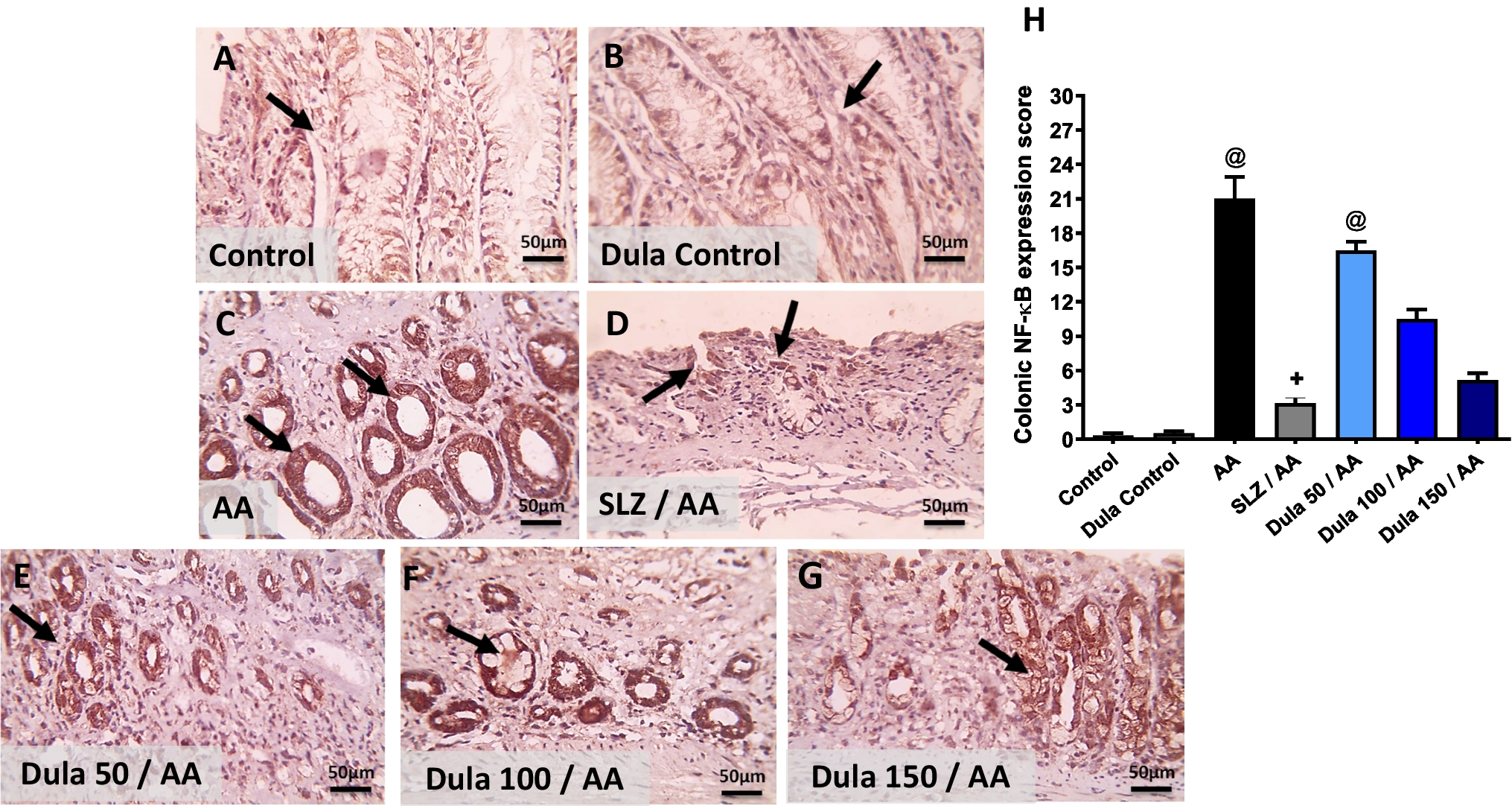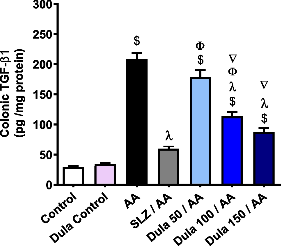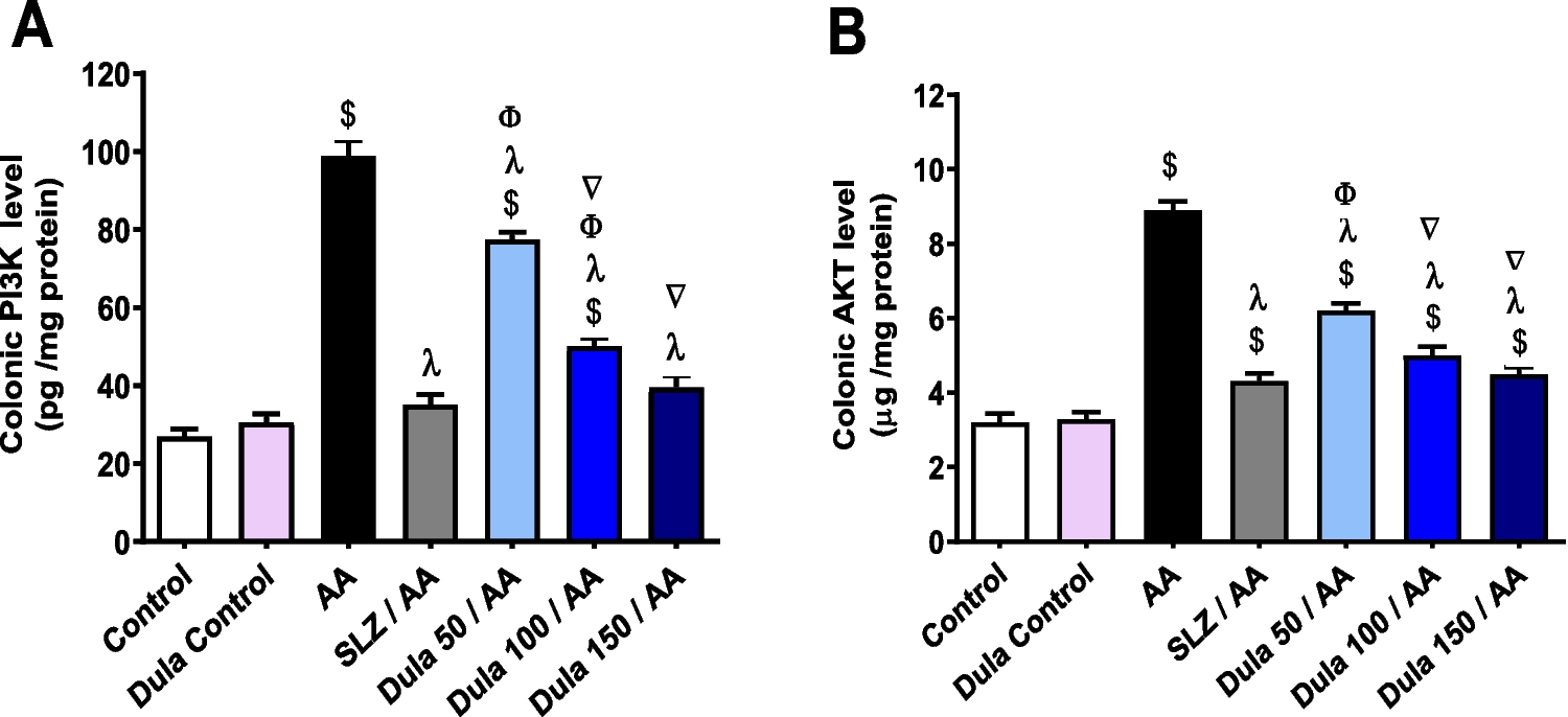 The AA group in our research displayed higher levels of TGF-β1/PI3K/AKT and NF-κB as well in comparison to the control group and Dula (50, 100, and 150 μg/kg) groups and, however, showed a noteworthy drop in AKT, PI3K, TGF-β1, and NF-κB levels. These results corroborated the findings of Ali et al.’s study, which showed that TGF-β1 levels dramatically dropped after receiving Dula therapy in male albino rats who had experimentally induced diabetic kidney disease (Ali et al. 2022) and with the previous study of Park et al. which found that Dula decreased TGF-β1 level due to its anti-inflammatory effects on inflammatory signaling, oxidative stress, and cytokine production in obesity-induced airway hyperresponsiveness and fibrosis in a mouse model (Park et al. 2019). Following findings from earlier research (Zaghloul et al. 2022, El Mahdy et al. 2023) which reported raised PI3K and AKT levels in a rat model of AA-induced colitis and a recent study which discovered that acute AA-induced colitis in rats contributed to an upregulation of PI3K and AKT (Xu et al. 2022), this was compatible with our results which showed that the AA group had higher colonic PI3K and AKT levels as compared to the control group. However, Dula (50, 100, and 150 μg/kg) lowered the raised PI3K and AKT levels. To our awareness, this is the original work that confirmed the effect of Dula in decreasing the elevated levels of PI3K and AKT in a rat model of AA-induced colitis.