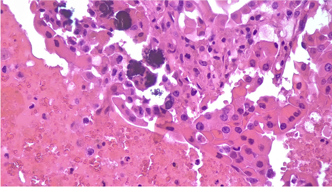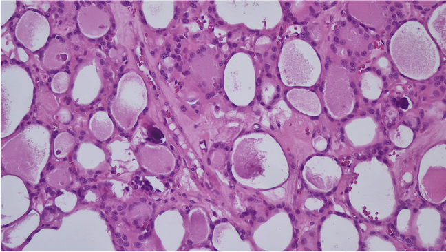 The exact origin and significance of PB in benign cases remain unclear and under evaluation [1‐5]. It is commonly agreed-upon that PBs represent infarcted and necrotic cells from papillary structures of a PTC which have been layered in a concentric fashion with calcific deposits. This is further confirmed by the published data which has clearly demonstrated that PB are a feature for a PTC, including those cases in which cancer is not readily identified [2‐6]. The question arises for those rare scenarios in which, despite all efforts (submission of entire thyroid resection, deeper levels), a neoplasm is not encountered. This diagnostic dilemma has been tackled by studies which have documented that PBs can be seen in benign thyroid lesions.