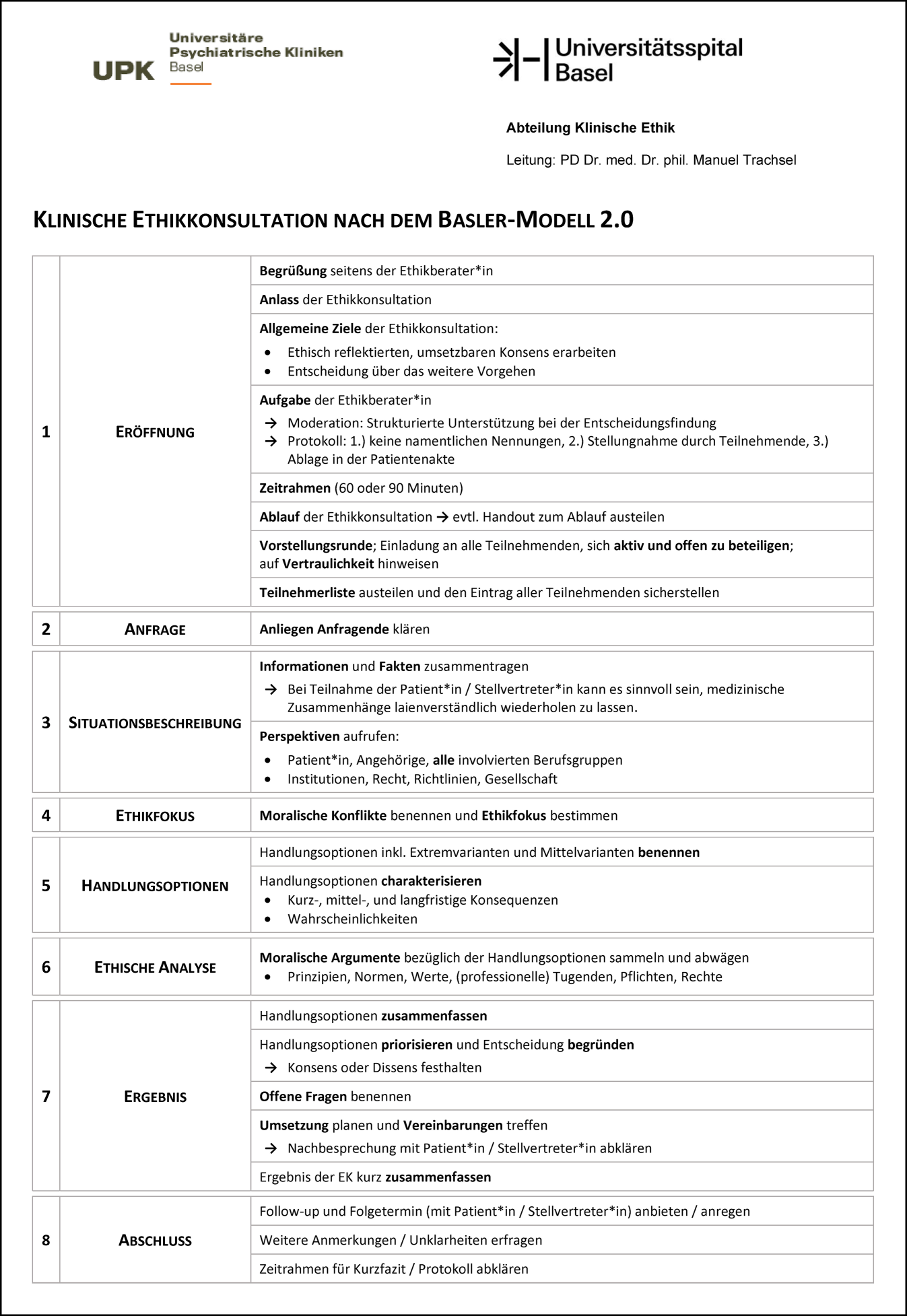 Nach der Begrüßung der Teilnehmenden rekapituliert der*die moderierende Ethikberater*in den Anlass der Ethikkonsultation. Dazu gehört eine Beschreibung der allgemeinen Ziele einer Ethikkonsultation und der Aufgaben der Ethikberater*innen hinsichtlich Moderation und Protokoll. Anschließend wird der zeitliche Rahmen geklärt und der Ablauf der prinzipienorientierten Ethikkonsultation nach dem Basler Modell 2.0 in acht Schritten skizziert. Damit die Teilnehmenden während der Ethikkonsultation den Überblick über die Schritte behalten, wird der Ablauf zusätzlich auf einem Handout verteilt (Abb. 3). Anschließend folgt eine Vorstellungsrunde.