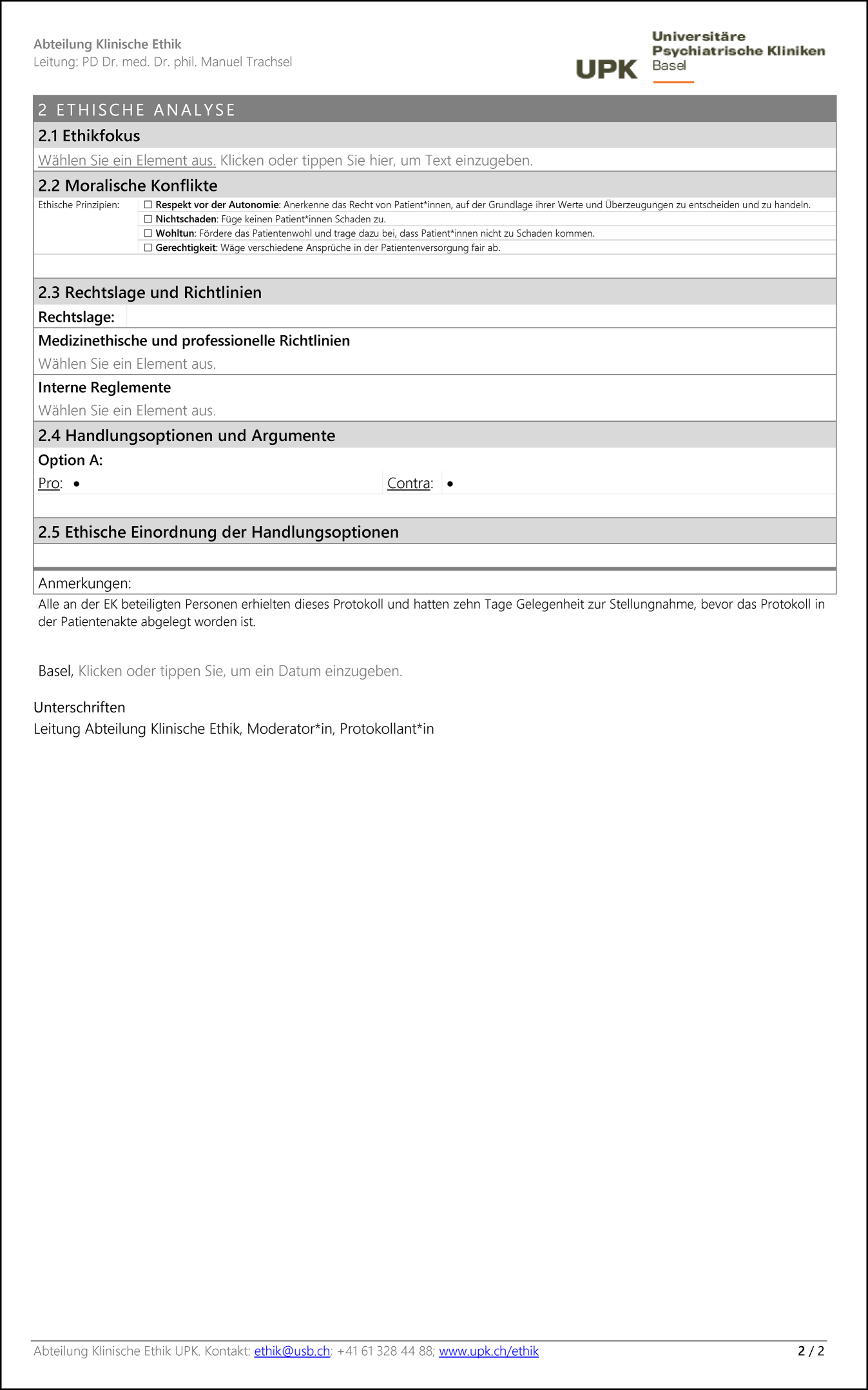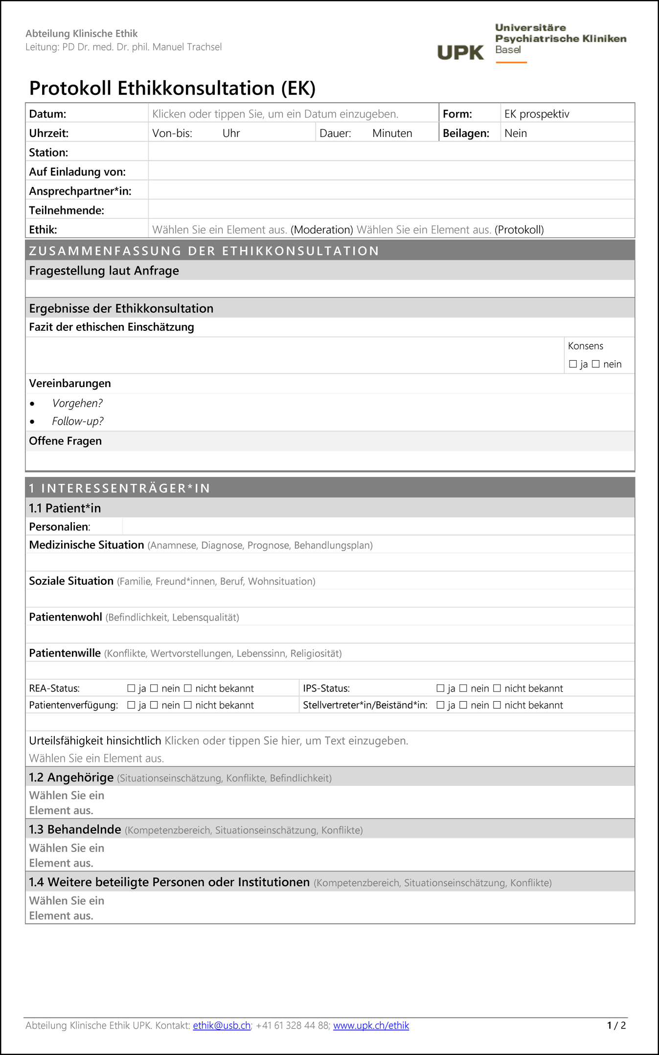 Protokollvorlage zur Dokumentation einer klinischen Ethikkonsultation nach dem Basler Modell 2.0 in den Universitären Psychiatrischen Kliniken (UPK). Eine bearbeitbare Version dieser Vorlage kann zur freien Verwendung kostenlos unter folgendem Link heruntergeladen werden: https://www.unispital-basel.ch/medizinische-direktion/klinische-ethik/tools_klinikerinnen. IPS Intensivpflegestation, REA Reanimation