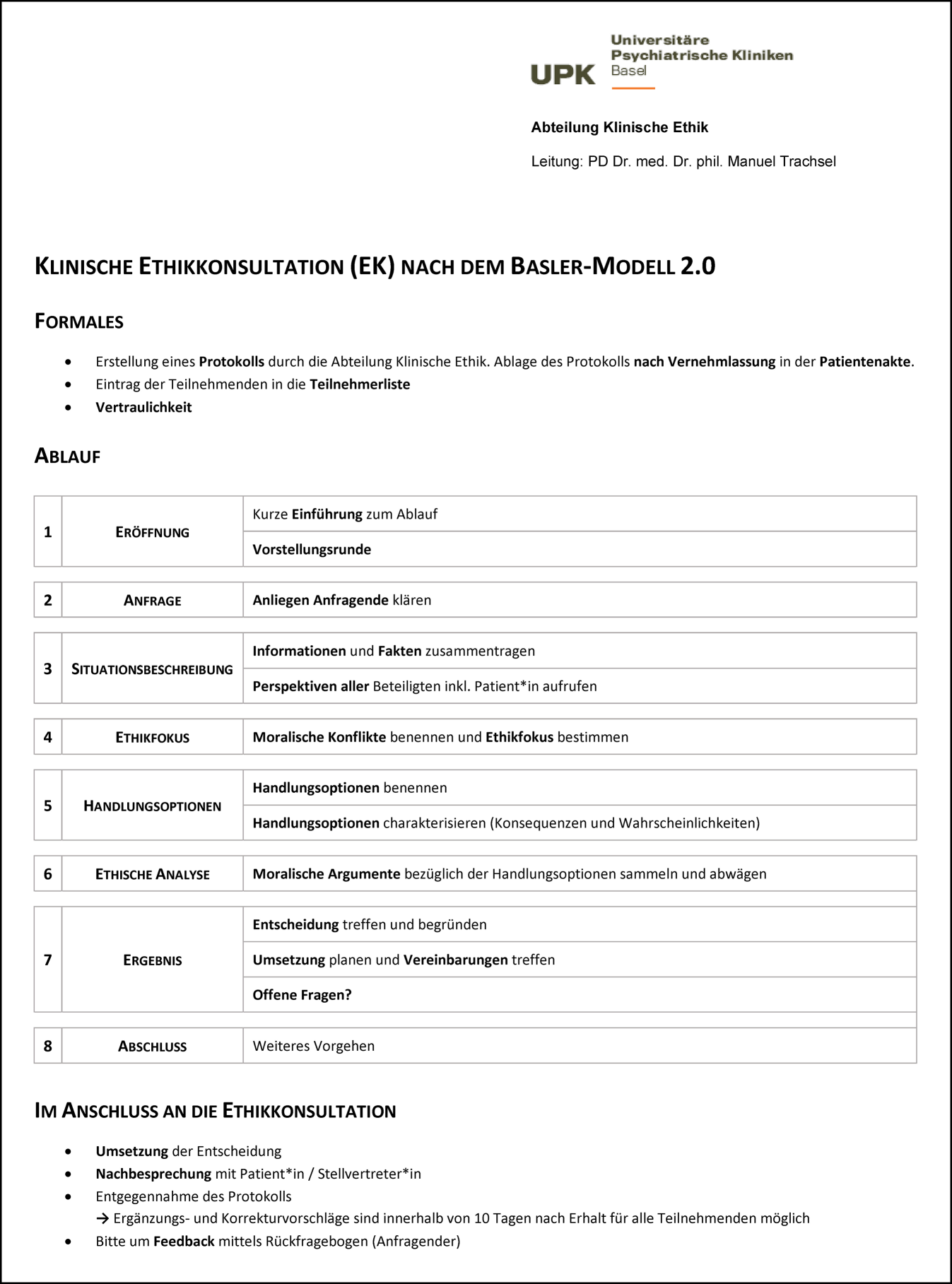 Im vorliegenden Beitrag wird das Basler Modell der prinzipienorientierten klinischen Ethikkonsultation 2.0 vorgestellt, das an der Abteilung Klinische Ethik am Universitätsspital Basel (USB) und an den Universitären Psychiatrischen Kliniken Basel (UPK) entwickelt wurde und dort seit vielen Jahren erfolgreich eingesetzt wird. Anschließend wird auf die besondere Stellung der klinischen Ethik an den UPK eingegangen. Das weiterentwickelte Basler Modell der prinzipienorientierten klinischen Ethikkonsultation 2.0 wird erläutert und dessen Anwendung schrittweise dargestellt.