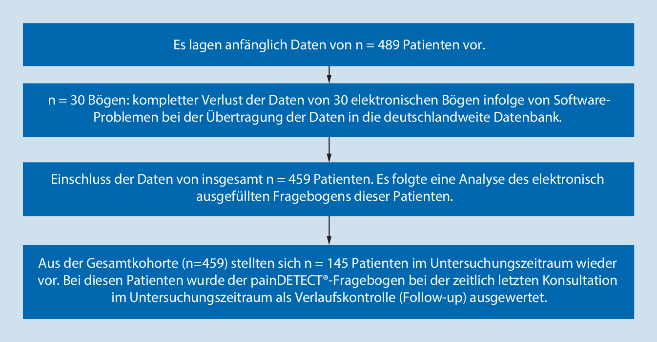Die Datenerfassung und -auswertung erfolgte mittels des elektronischen Systems painDETECT®. Einmal im Quartal wurden mittels des elektronischen painDETECT®-Fragebogens psychometrische Befunde jedes Patienten der Schmerzambulanz der MHH erhoben. Seit Oktober 2008 werden die erfassten Patientendaten alle 12 bis 15 Monate in eine deutschlandweite Pooldatenbank (Institut StatConsult) übertragen und durch das Institut StatConsult in SPSS überführt. Für diese Analyse und Übertragung der zunächst pseudonymisierten und später anonymisierten Daten lag die schriftliche Einwilligung der Patienten vor [3]. Nach Einholen des positiven Ethikvotums der lokalen Ethikkommission wurden in dieser Studie SPSS-Daten von insgesamt 459 Patienten der Schmerzambulanz der MHH retrospektiv erfasst (Abb. 1). Neben dem Zeitpunkt des Einschlusses in die Studie (Zeitpunkt 1) wurde die im Untersuchungszeitraum zeitlich letzte Vorstellung (Follow-up) ausgewertet.