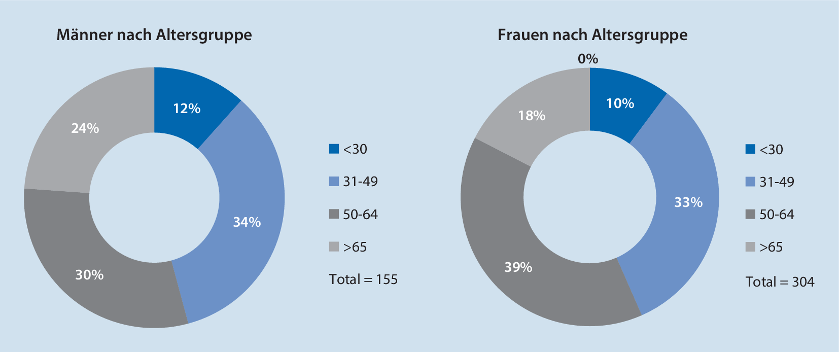 Der Frauenanteil überwog in der untersuchten Kohorte mit 66,2 %. Das durchschnittliche Alter im Gesamtkollektiv lag bei 51,1 ± 14,9 Jahren (Abb. 2). Die 50- bis 65-Jährigen hatten mit 36,2 % den größten Anteil, während die mittlere Altersgruppe der 31- bis 49-Jährigen mit 33,6 % vertreten war. In der Altersgruppe der bis 30-Jährigen befanden sich mit 10,6 % die wenigsten Patienten. 19,6 % der Studienteilnehmer waren 65 Jahre und älter. Abb. 3 zeigt die Verteilung der Altersgruppen bei beiden Geschlechtern.