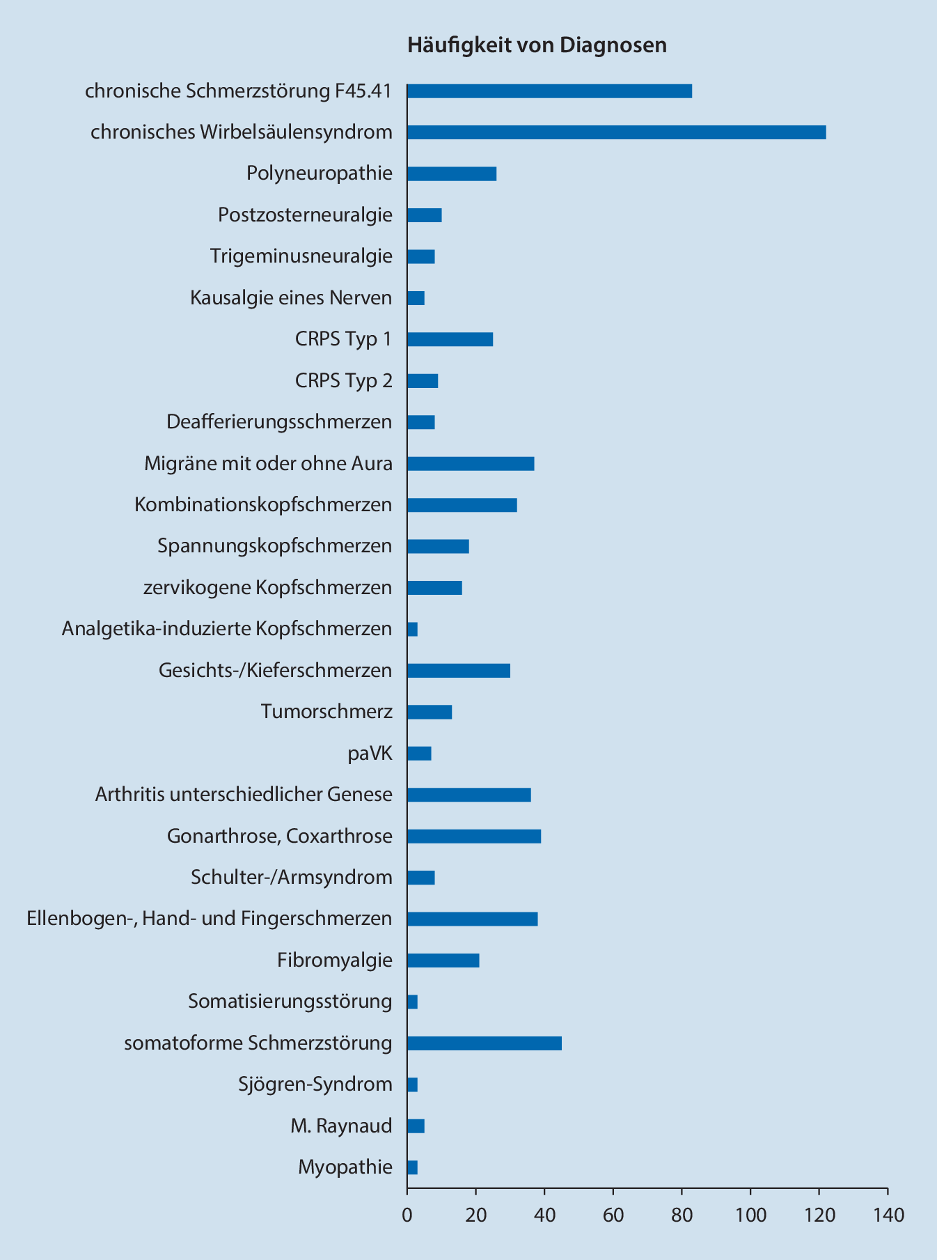 Übersicht über die anhand der Arztbriefe der Schmerzambulanz erhobenen Häufigkeiten schmerzbezogener Diagnosen. CRPS Komplexes regionales Schmerzsyndrom, paVK periphere arterielle Verschlusskrankheit, M. Raynaud Morbus Raynaud