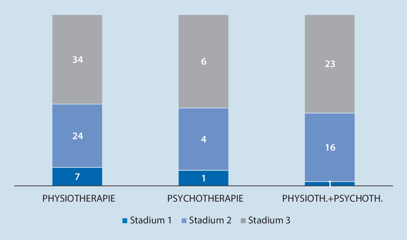 Anzahl an Patienten eingeteilt nach Chronifizierungsstadium (MPSS), die zum Zeitpunkt des Follow-ups Physiotherapie, Psychotherapie bzw. beides erhielten
