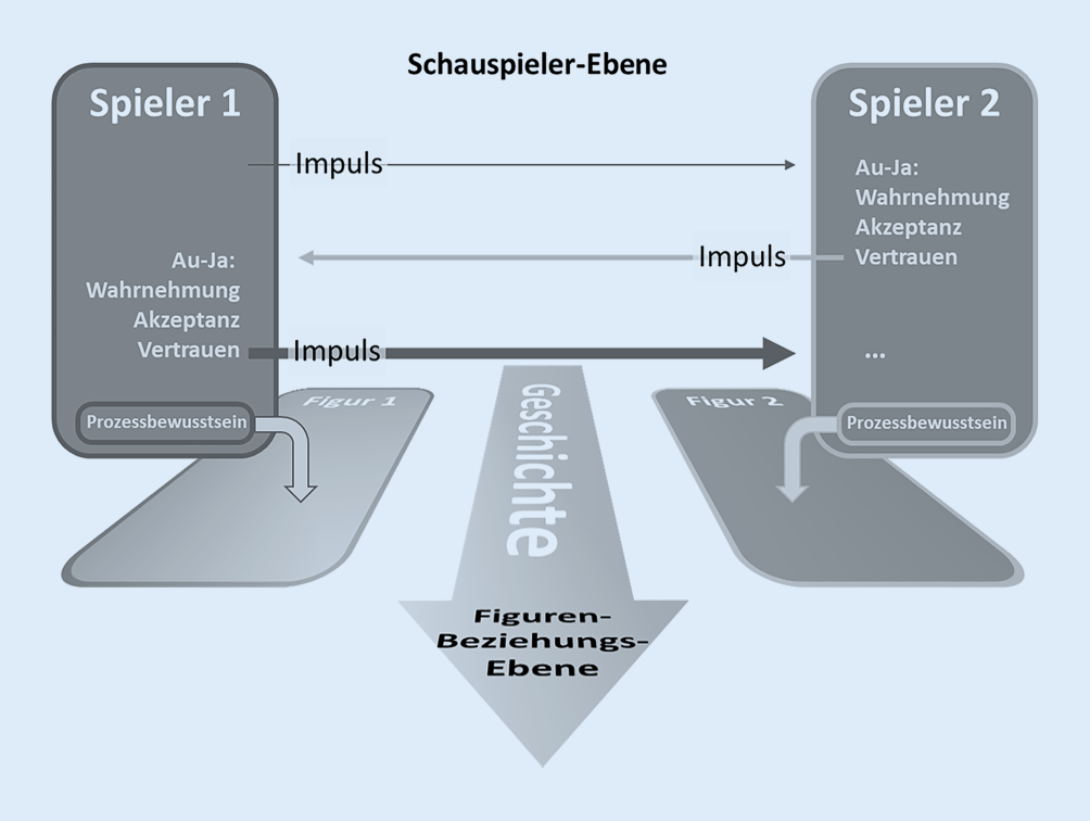 Improvisationstheater als ein Wechselspiel von Angeboten (Impulsen) zwischen Schauspielenden auf der Schauspielerebene, die zu einer Geschichte auf der Figurenbeziehungsebene führt: Aus der Interaktion der Schauspielenden, die sich vertrauensvoll wechselseitig Impulse senden, diese akzeptieren und vergrößern, entwickelt sich die Geschichte zweier Figuren. Die Schauspielenden müssen in einer Art doppelter Anwesenheit zwischen ihren Bedürfnissen als Schauspielende – eine gute Geschichte zu entwickeln – und den Bedürfnissen als Figuren unterscheiden. Mit diesem Prozessbewusstsein können sie zum passenden Zeitpunkt den Impuls, den die Geschichte braucht, an die anderen Spielenden geben