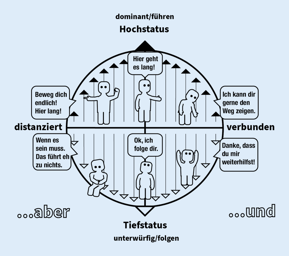 Diese körperzentrierten Ansätze lassen sich als kurze Szenen sowohl im Einzel- wie im Gruppenkontext einsetzen. Während dieser spielerischen Erkundungen des Beziehungsraums gilt selbstverständlich in jeder Übung auch das Au-ja-Prinzip. Die Spieler:innen machen so die Erfahrung, dass ihre Impulse und Statusangebote wahr- und angenommen werden. Diese positive Erfahrung hilft dabei, flexibles Statusverhalten aufzubauen und zu lernen, die Statusgestaltung bzw. die flexible Navigation im gesamten Circumplexmodell als persönliche Ressource zur Erreichung eigener Ziele und Wünsche einzusetzen (Abb. 3).
