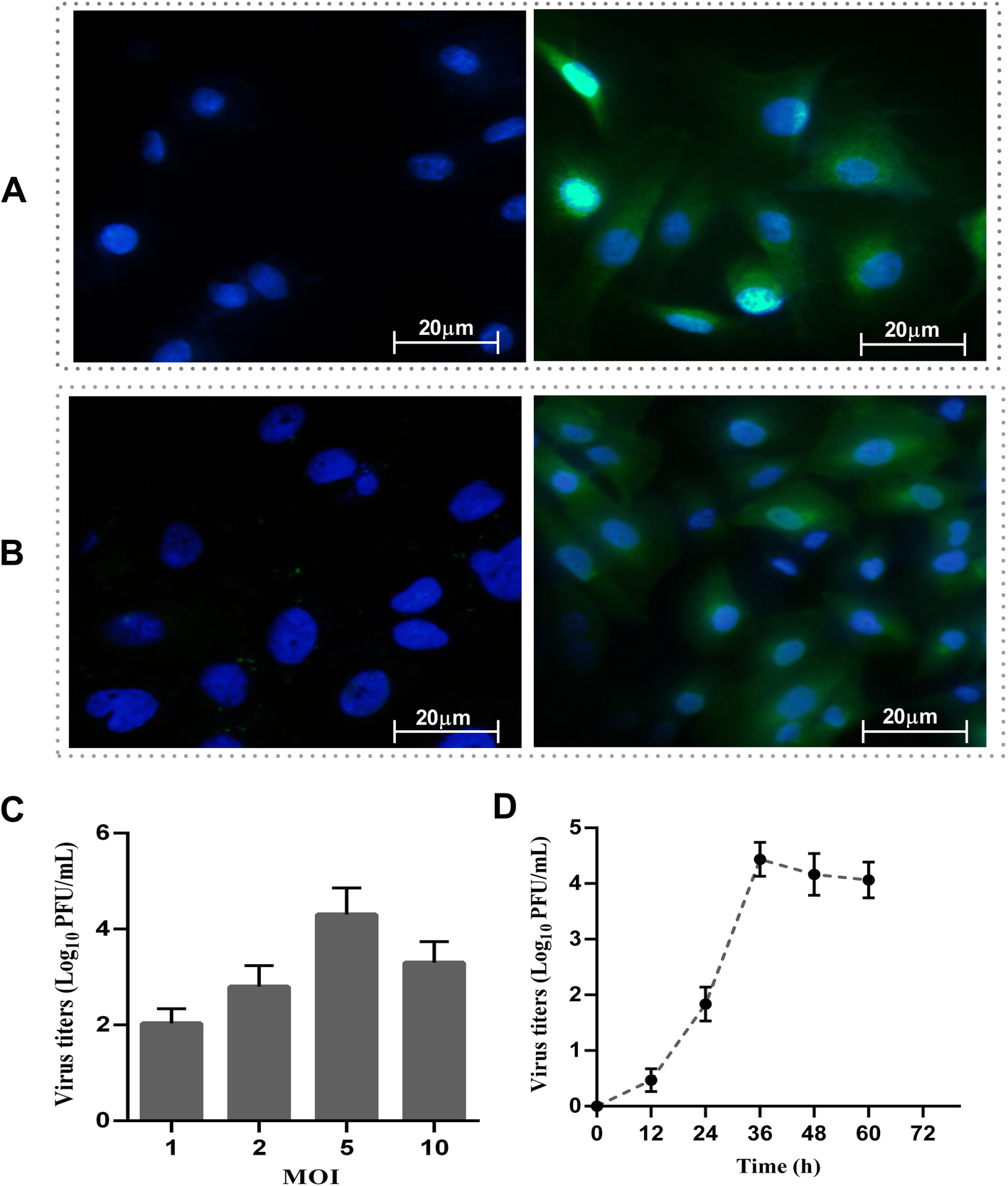 Maackia amurensis lectin II (VECTOR, CA, USA) staining and then followed by staining with FITC-conjugated avidin D (green) and DAPI (blue) for nuclei. To assess H9N2 virus infection, RPMECs were washed with PBS, inoculated with virus at different multiplicities of infection (MOIs) and incubated for 1 h. Then, the cells were washed with PBS and incubated with DMEM, 0.2% bovine serum albumin (Gibco, Carlsbad, CA, USA) and 0.2 μg/mL TPCK-treated trypsin [