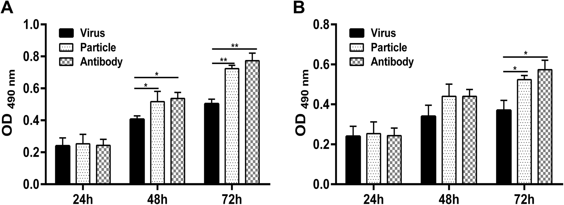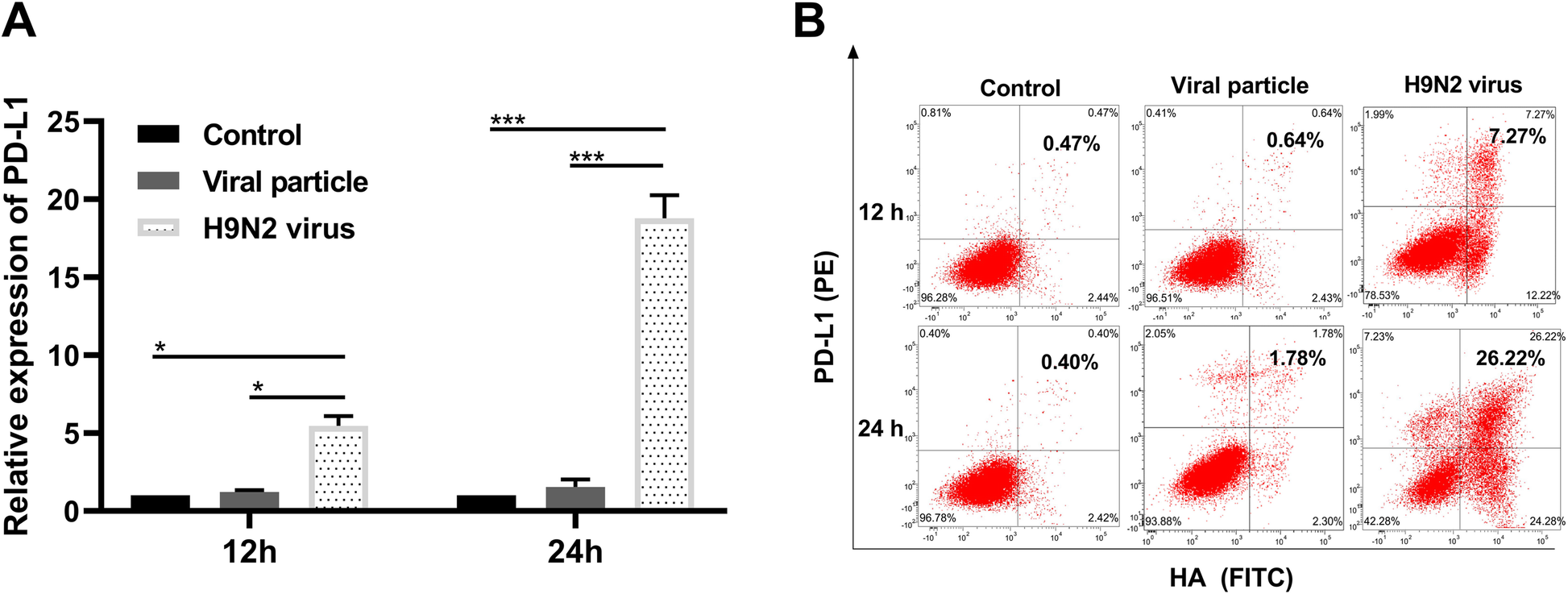 RPMECs infected with live H9N2 virus or inoculated with viral particles were harvested at 6, 12 and 24 h postinfection, and total RNA was isolated using TRIzol reagent (Invitrogen, Carlsbad, CA, USA). The fold change of the PD-L1 mRNA level in different groups relative to the control group was calculated using GAPDH as the housekeeping gene. The primer sequences were as follows: GAPDH: F, 5′ ACAACTTTGGTATCGTGGAAGGAC3’ and R, 5’AGGGATGATGTTCTGGAGAGCC3’; PD-L1: F, 5’GGAGGACCTGAAGCCTCAAC3’ and R, 5’CGTCCTGCAGCTTGACATCT3’.