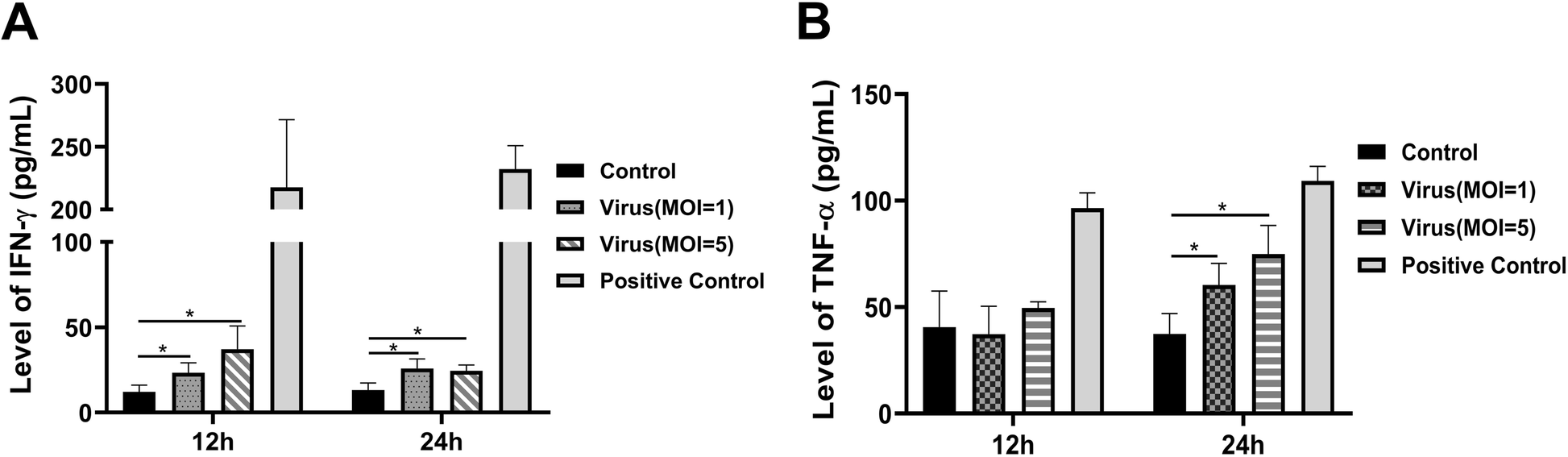 To evaluate the levels of IL-2, IFN-γ and granzyme B, T cells that migrated to the lower chamber were harvested, reseeded in a 12-well plate, and cultured for 48 h. The supernatants were collected and measured by ELISA kits (R&D Systems Inc., MN, USA) according to the manufacturer’s instructions. To determine the levels of IFN-γ and TNF-α induced by the H9N2 virus, T cells were infected with the H9N2 virus at an MOI of 1 or 5. Supernatants were collected from each group at 12 h and 24 h postinfection and analyzed using ELISA kits (R&D Systems Inc., USA).