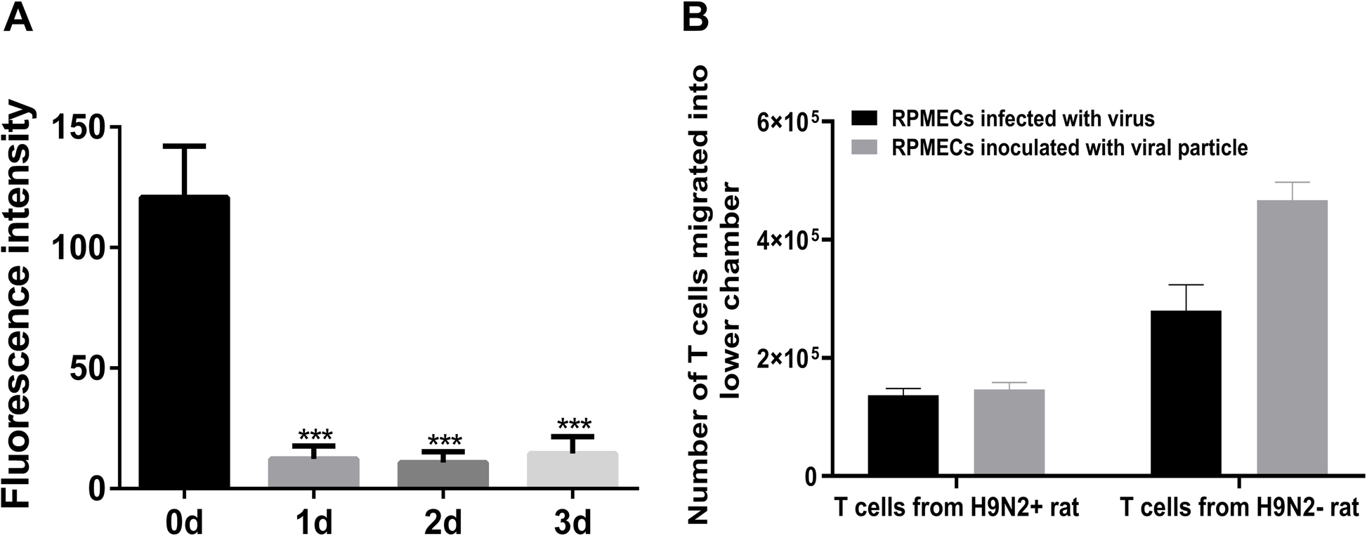 The T cell/RPMEC coculture system was established in transwell chambers with 6-well inserts (Corning, Shanghai, China). The RPMECs were seeded in the upper chambers at a concentration of 1 × 105 cells/well, and the confluence of the RPMEC monolayers was detected on days 0, 1, 2 and 3 by measuring permeability to FITC-labeled dextran (Sigma Aldrich, Shanghai, China). Then, RPMECs were infected with the H9N2 virus or inoculated with viral particles. After 24 h, T cells were plated over the infected monolayer and incubated for 8 h, Afterwards, the migrated T cells in the lower chamber were harvested and analyzed further. A viral particle control was used since normal MECs expressed very low levels of adhesion molecules, which caused a decreased proportion of migrating T cells. The transmigrated T cells in samples from the bottom chamber were counted by a TC-20 cell counter (Bio-Rad, CA, USA).