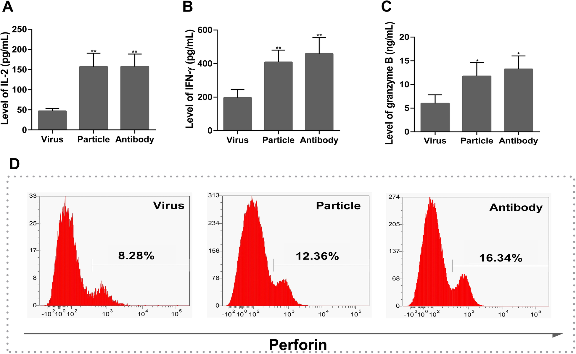 22]. Then, the cells were incubated with a PE-labeled antibody against PD-L1 (BioLegend, CA, USA) and a FITC-labeled antibody against H9N2 virus hemagglutinin (Sino Biological, Beijing, China). To detect intracellular perforin, the T cells were fixed, permeabilized with 4% paraformaldehyde in PBS for 10 min at room temperature and stained with an anti-perforin primary antibody (Santa Cruz Biotechnology, Dallas, USA) and a FITC-labeled secondary antibody (ORIGENE, Rockville, MD, USA). All labeled cells were analyzed by flow cytometry, and 10,000 events were acquired per sample. The protein expression levels were evaluated in terms of the percentage of positively labeled cells.