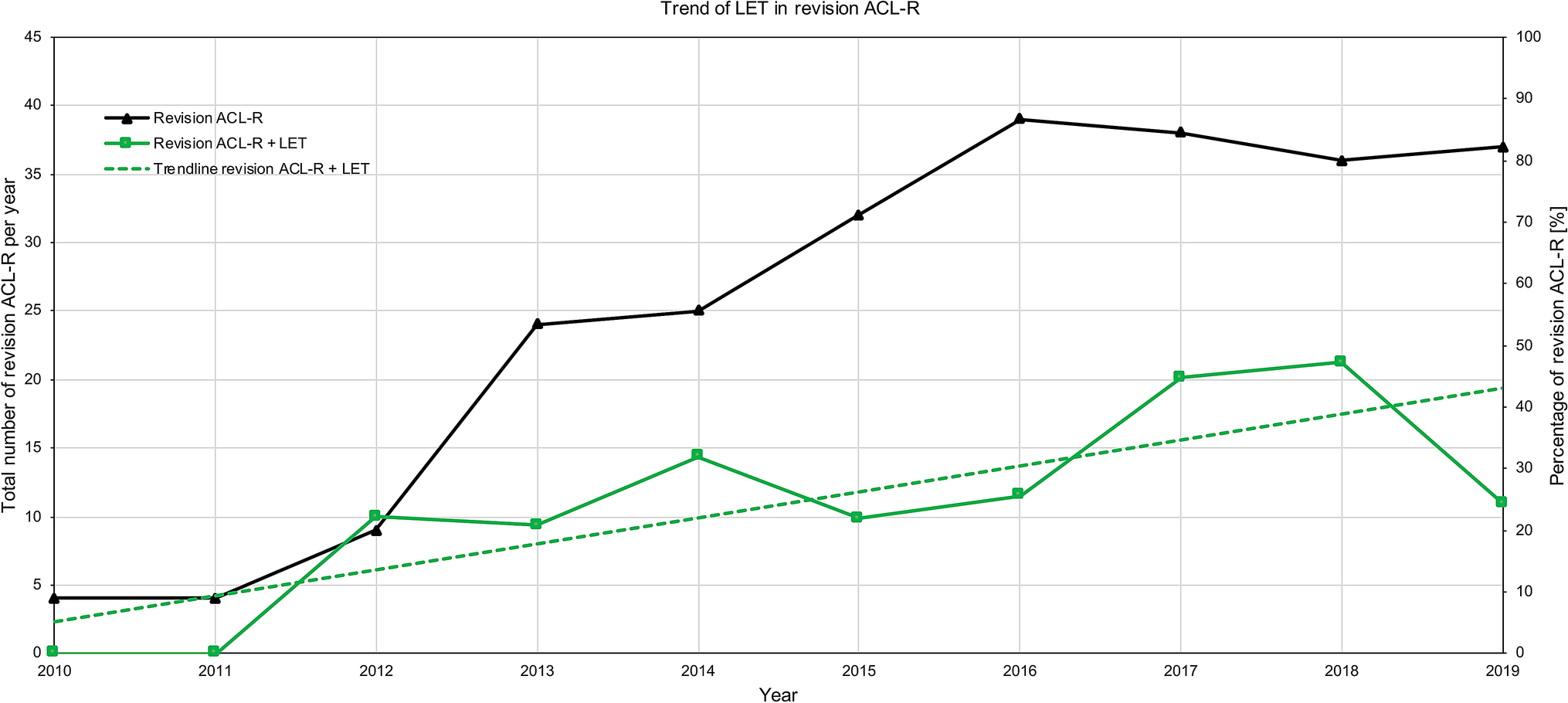 Categorical variables were expressed as number of patients and percentage of the corresponding group. Continuous variables were reported as mean ± standard deviation and range. Group comparisons with two independent variables (male vs. female; right vs. left; 2010–2014 vs. 2015–2020) were performed by the Chi-squared test for categorical variables and by the unpaired t test or Mann–Whitney U test for continuous variables. Group comparisons for the three pre-defined age groups (< 20 years vs. 20–30 years vs. > 30 years) were performed by the Chi-squared test (followed by a post hoc test with Bonferroni corrected p values) for categorical variables and by a one-way analysis of variance or the Kruskal–Wallis test (followed by post hoc testing) for continuous variables. To assess the trend of concurrently performed procedures over the 10-year period, a time series analysis (i.e., linear regression model) was performed. The percentage of combined revision ACL-R (ACL-R + meniscus surgery, ACL-R + LET, ACL-R + osteotomy) among all revision ACL-Rs performed annually represented the dependent variables, while the corresponding year represented the independent variable [2]. Given the descriptive design of this study and that all patients available were included, an a priori sample size calculation was not conducted. SPSS software version 26.0 (IBM-SPSS, New York, USA) was used for statistical analysis. The level of significance was defined as p < 0.05.