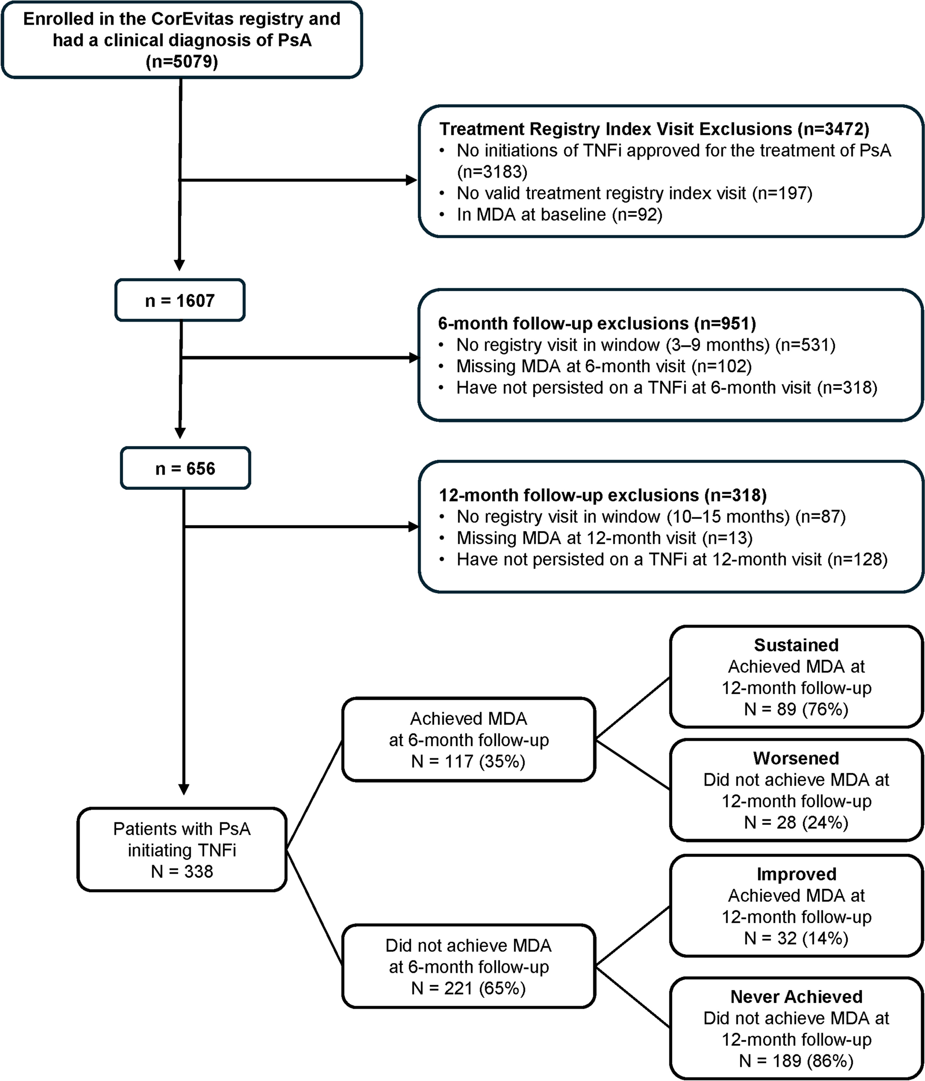 The PsA observational cohort for this analysis included patients with PsA enrolled in the CorEvitas PsA/SpA Registry, who initiated (from April 2013–August 2022) and persisted on the same TNFi of any line of therapy at or after the enrollment visit. Patients could not switch to another TNFi to be included in this study. Patients had to have a clinical diagnosis of PsA made by the treating rheumatologist, not be in minimal disease activity (MDA)[