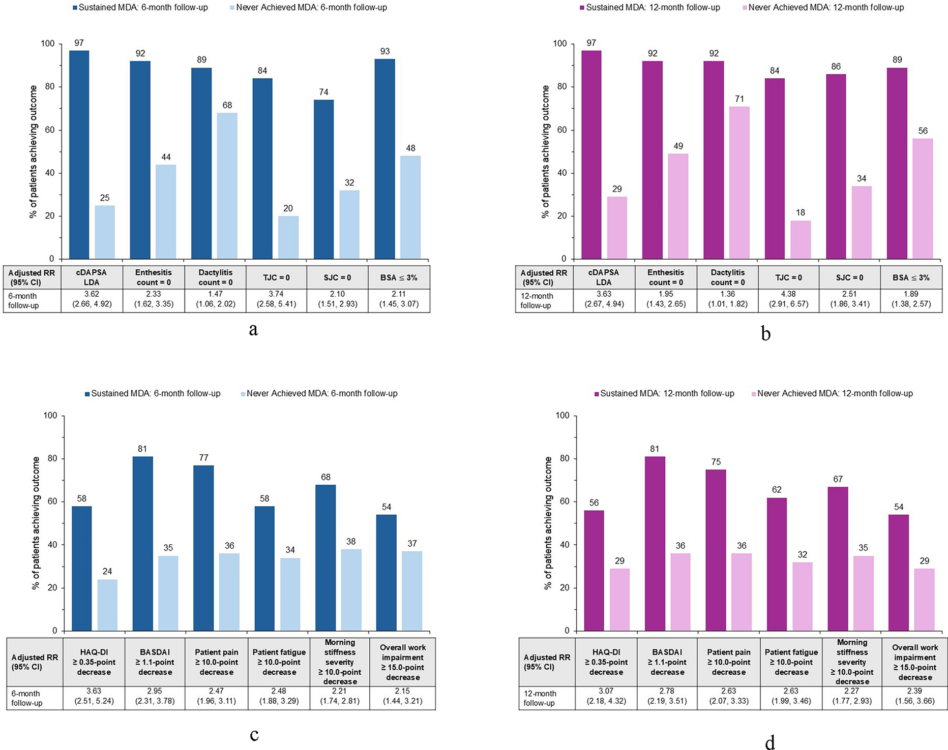 Clinical features, stratified by MDA status, were assessed at the 6- and 12-month follow-up visits for each of the four subgroups (sustained, improved, worsened, or never achieved status, respectively) and included Clinical Disease Activity in Psoriatic Arthritis low disease activity (cDAPSA LDA) composite score [