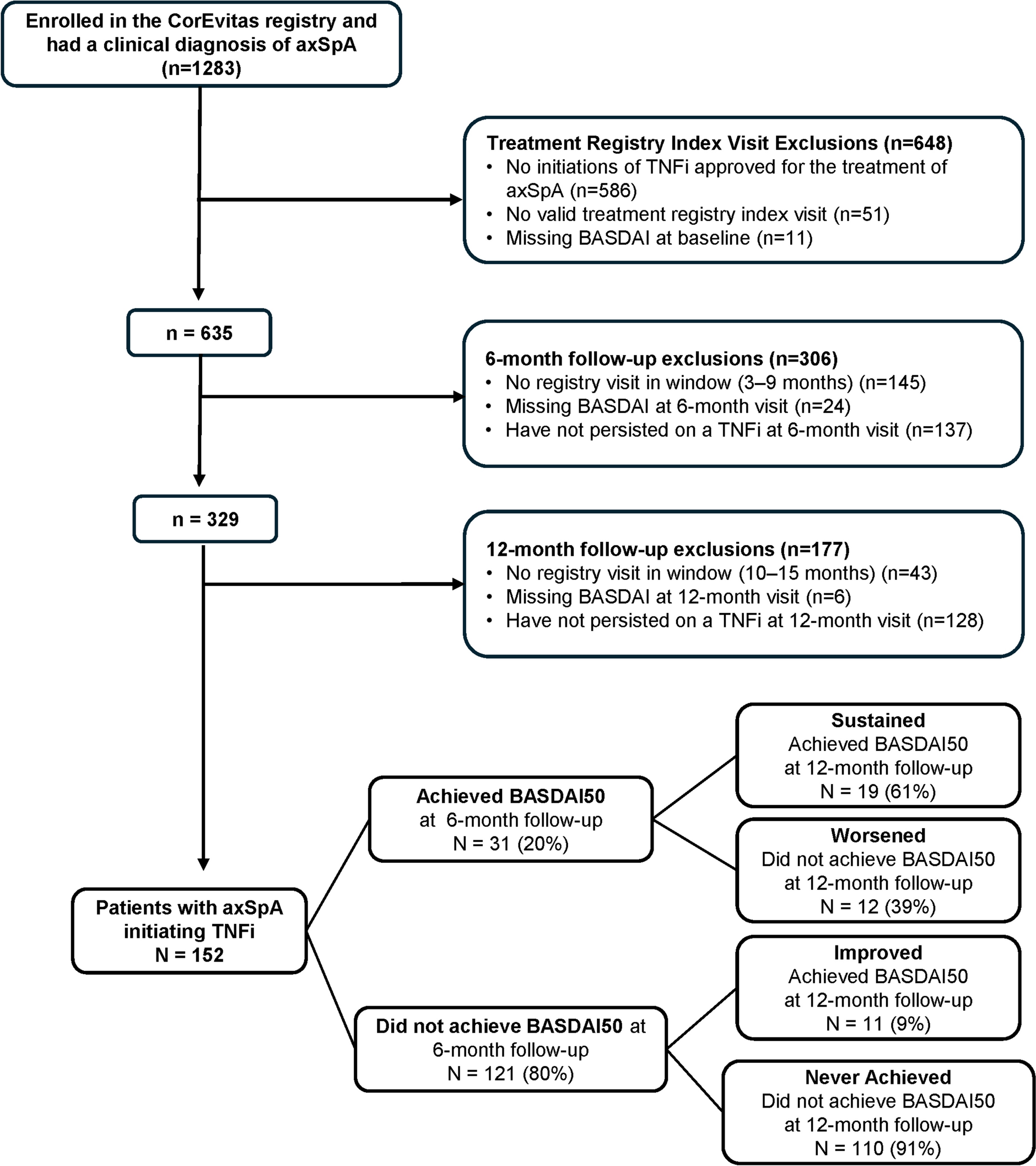 The axSpA observational cohort for this analysis included patients with axSpA enrolled in the CorEvitas PsA/SpA Registry who initiated (from August 2013–August 2022) and persisted for 12 months on the same TNFi of any line of therapy, at or after the enrollment visit. Patients could not switch to another TNFi to be included in this study. Patients had to have a clinical diagnosis of axSpA as determined by the treating rheumatologist and have valid baseline and 6 (± 3)- and 12 (± 3)-month follow-up visits. BASDAI was used to determine patient-reported disease activity in patients with axSpA. BASDAI50 was defined as a ≥ 50% improvement from the original BASDAI score at baseline.