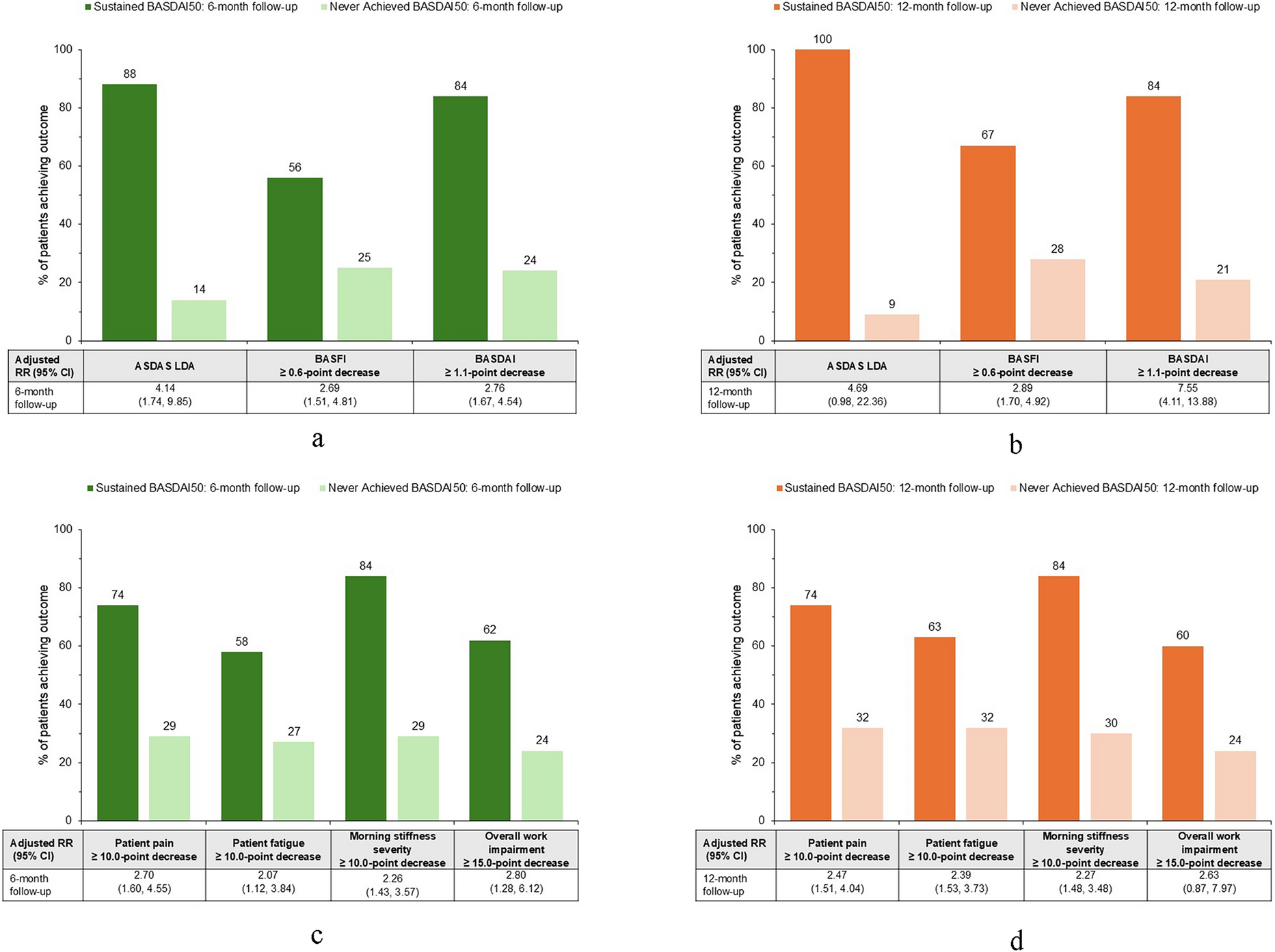 For analysis of data, patients with axSpA were stratified into one of four subgroups (sustained, improved, worsened, or never achieved status, respectively) according to their BASDAI50 status at the 6- and 12-month follow-up visits (Table