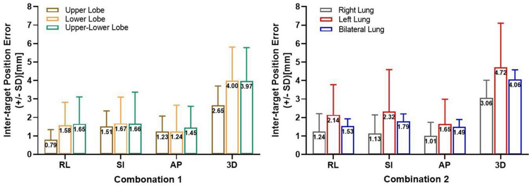 The percentage of treated fractions with a ΔD3D greater than 10 mm were low across all six subgroups, which were 0% in upper lobe group, 2.2% in lower lobe group, 3.0% in upper—lower lobe group, 0.9% in right lung group, 5.2% in left lung group and 2.6% in bilateral lung group, respectively. Similarly, the corresponding percentages of treated fractions with a greater than 5 mm were 6.2%, 22.5%, 26.9%, 11.2%, 32.3%, and 29.2% for the upper lobe, lower lobe, upper-lower lobe, right lung, left lung, and bilateral lung groups, respectively. Among fractions with ΔD3D exceeding 10 mm, a statistically significant difference was only observed in combination 2 (right vs. left lung): 0.89% compared to 5.21% (P = 0.016). Tumor pairs in the left lung almost doubled the risks of geometric miss compared to all other combinations. For fractions exceeding 5 mm ΔD3D, the statistical differences between subgroups mirrored the trends observed for intertarget position variations across both combinations.