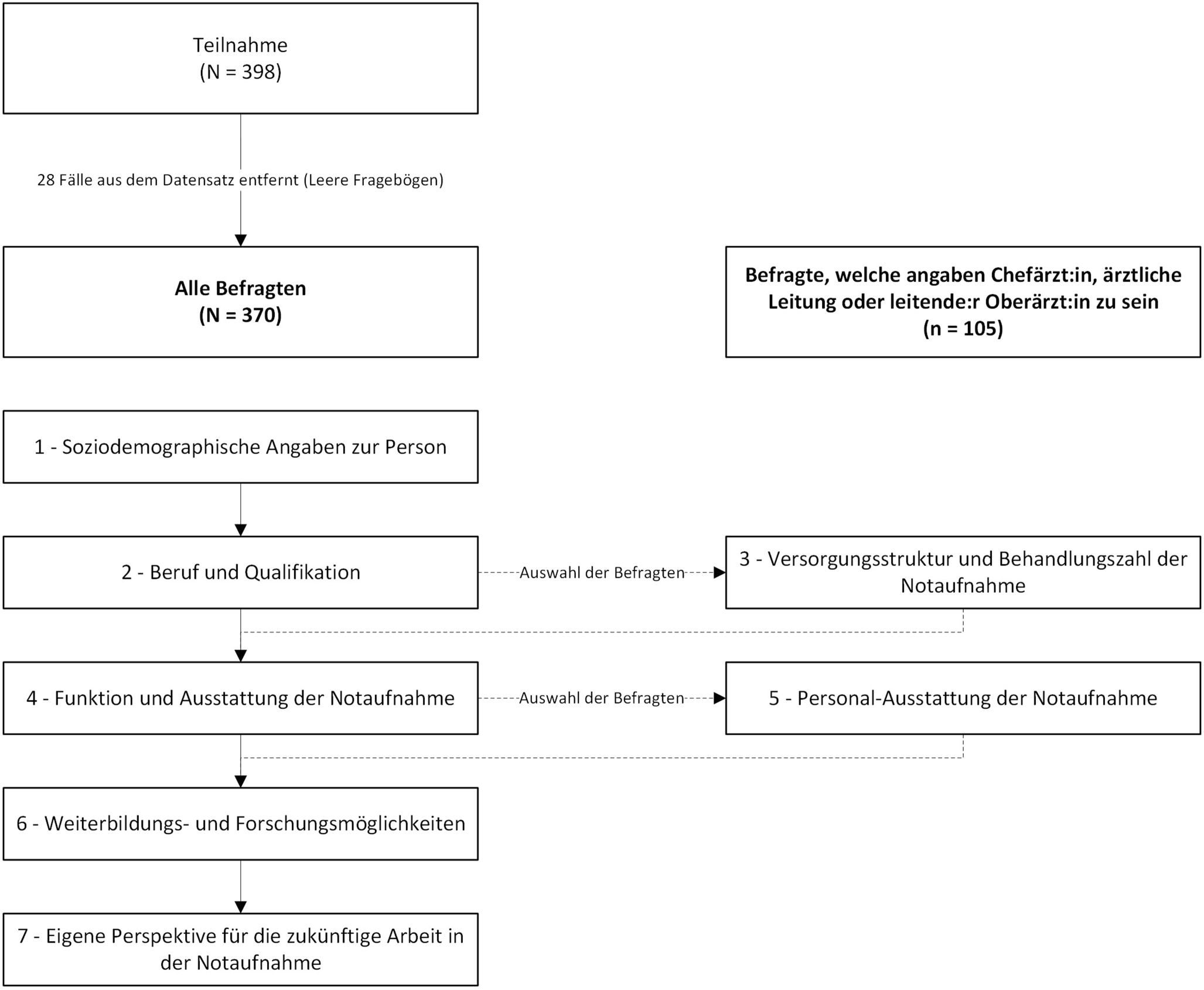 Zwischen Juli 2023 und Juli 2024 wurden Ärzt:innen in Notaufnahmen über notfallmedizinische Mailverteiler, Fachveranstaltungen und soziale Medien zur Teilnahme eingeladen. Die Befragung bestand aus 7 Modulen, von denen 5 allen Teilnehmenden offenstanden. Zwei weitere Module richteten sich gezielt an leitendes Notaufnahmepersonal.