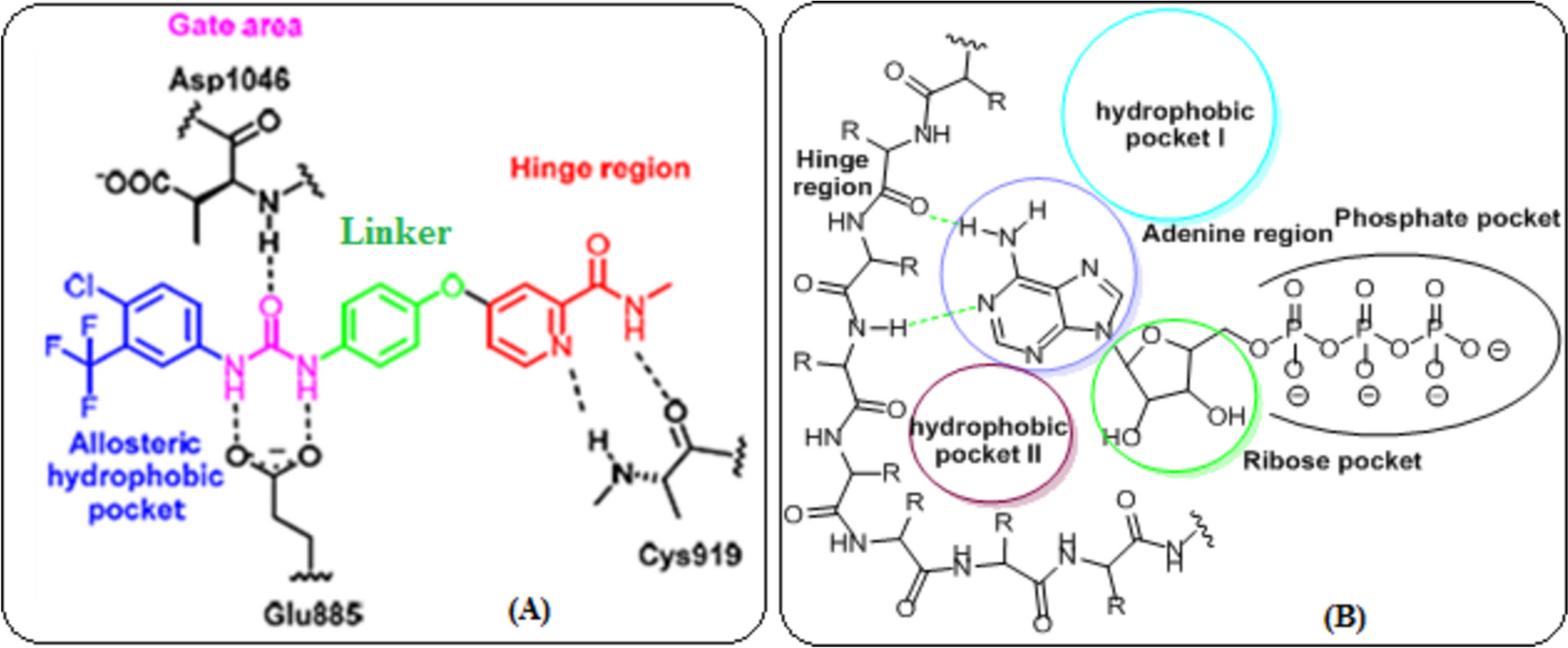 Regarding EGFR-TK, its ATP-binding pocket consists of five crucial regions can be targeted to enhance the pharmacokinetics of inhibitors (Fig. 1B) (Gandin et al. 2015). These regions include (a) the adenine region, where specific amino acids bond with the adenine ring by hydrogen bonds; (b) the hydrophilic ribose region; (c) hydrophobic region I, which is crucial for the selectivity of inhibitors; (d) hydrophobic region II, which can be utilized to enhance the specificity of inhibitors; and (e) the phosphate-binding sector.