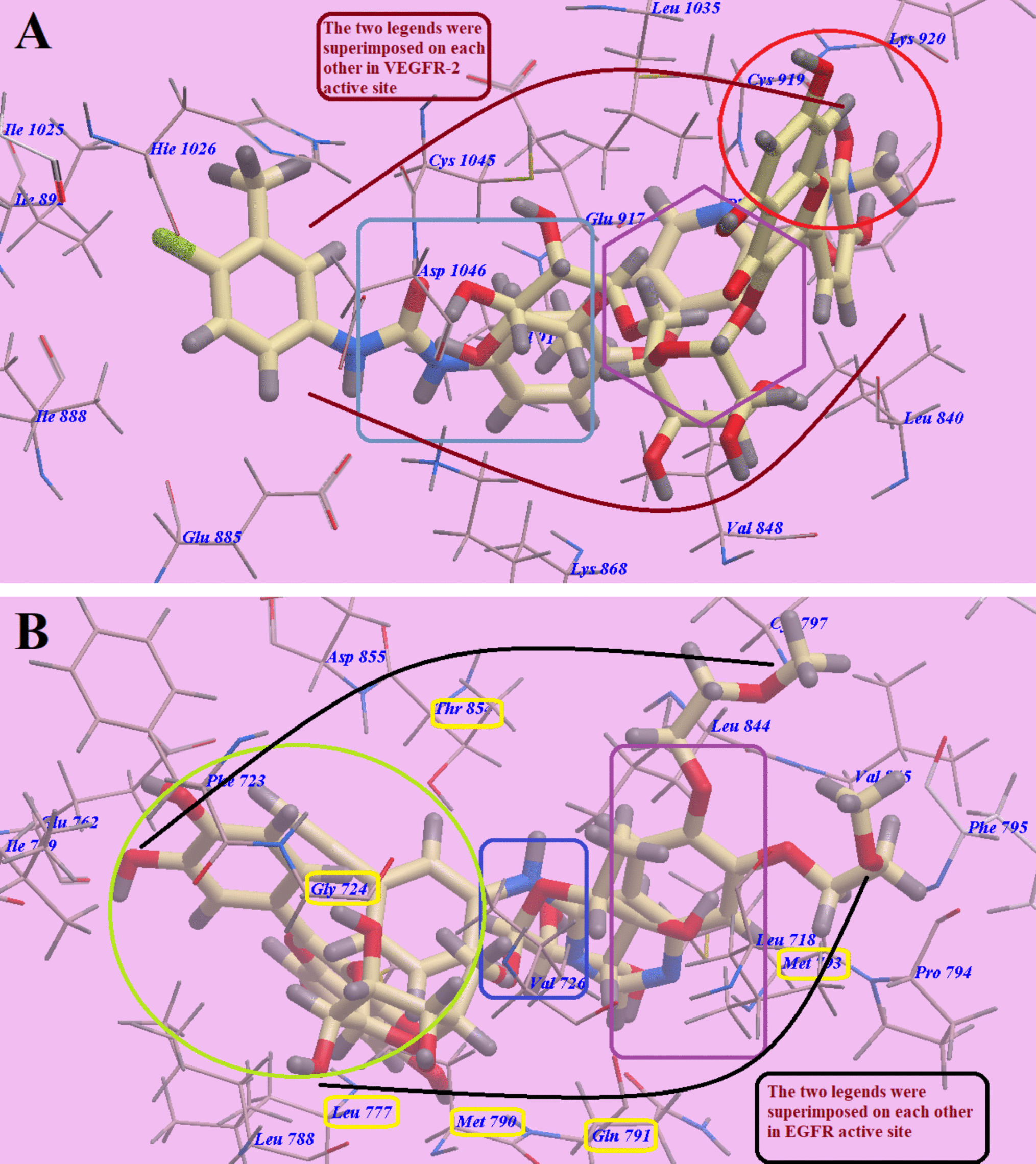 The superimposition of compound 4 with sorafenib (A) and erlotinib (B)