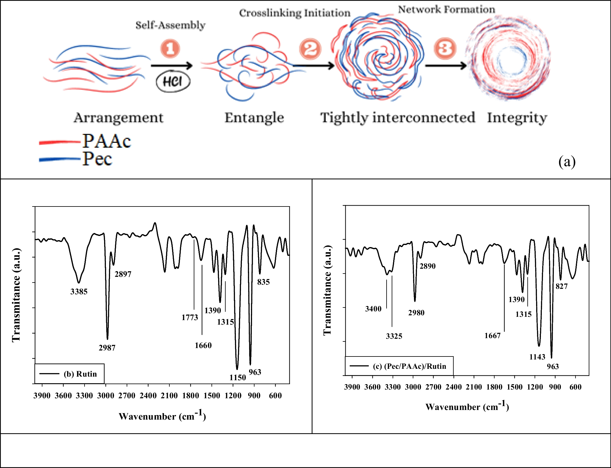 By comparing the observed peaks in Fig. 3c with the reference FTIR spectrum of rutin in Fig. 3b, and the known functional group vibrations, the changes in peak positions, intensities, and shapes provide strong evidence of the interactions between the (Pec/PAAc) nanogel and the rutin molecule.