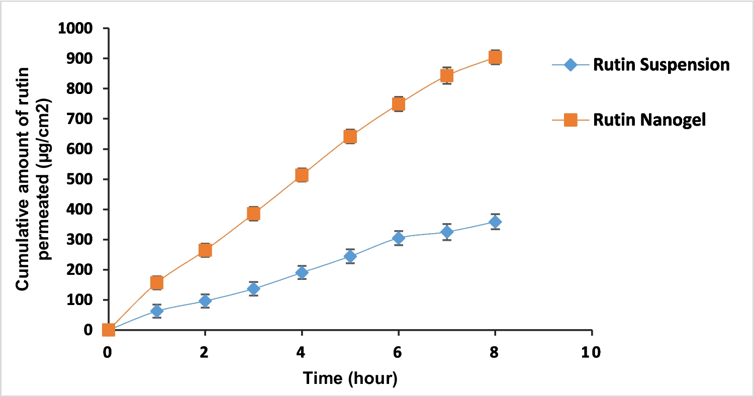 The study evaluated the drug diffusion potential of a prepared rutin nanogel formulation and a control rutin suspension using a vertical Franz diffusion cell apparatus. Hairless rat dorsal skin was frozen, stabilized with pH 7.4 phosphate buffer, and mounted in the Franz cell (Hassan et al. 2022). The receptor compartment was filled with pH 7.4 phosphate buffer, maintained at 32 ± 0.5 °C with constant stirring. The nanogel formulation and control were then applied to the excised skin. Samples were collected from the acceptor compartment and analyzed spectrophotometrically at 356 nm. This data was used to determine the drug flux at steady state (Jss), the permeability coefficient (Kp), and the enhancement ratio. The Jss was calculated by plotting the cumulative drug penetration per unit area (μg/cm2) versus time and finding the slope of the linear portion. The Kp was then calculated by dividing the Jss by the initial drug concentration (C0) (Abdou et al. 2017).