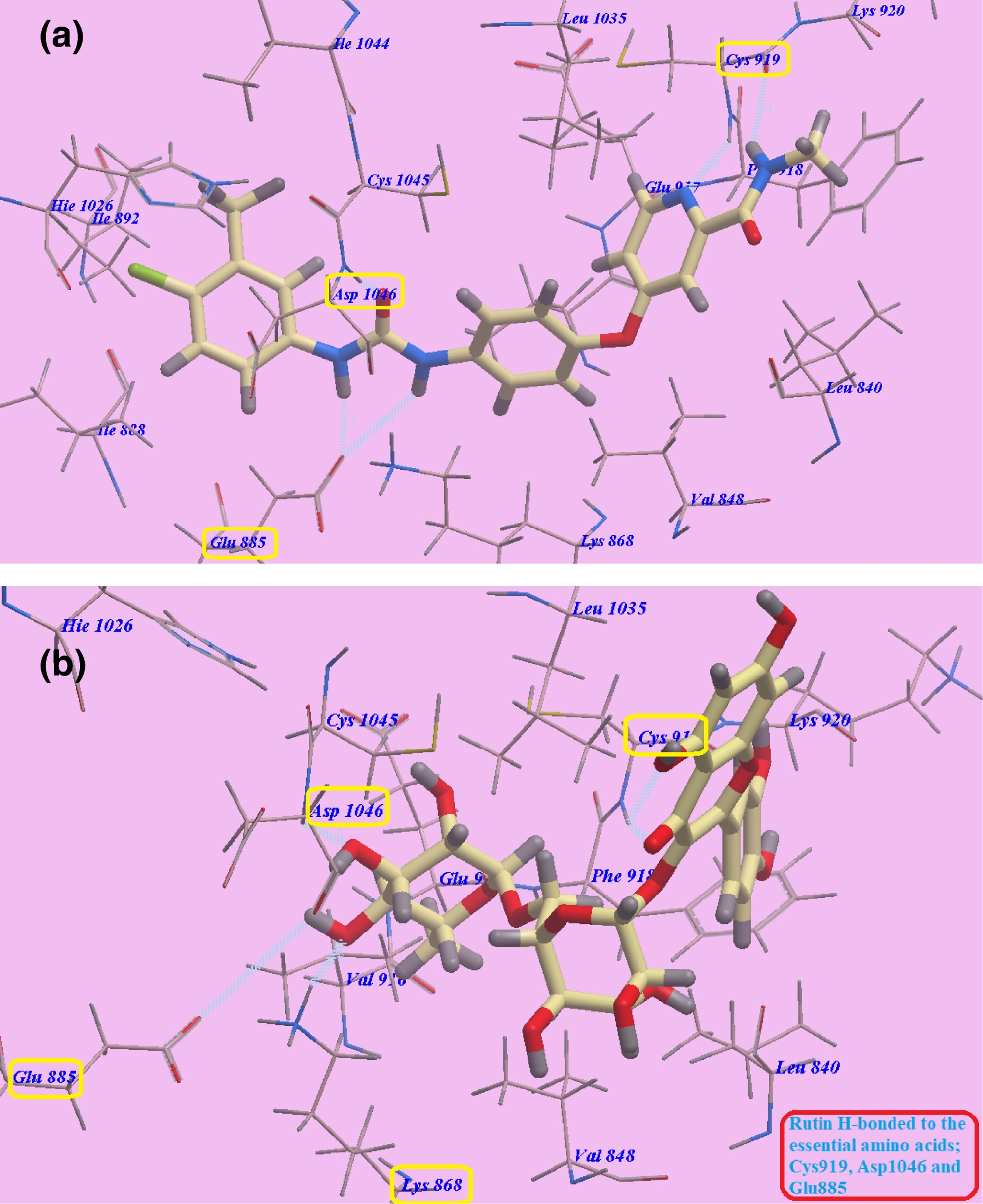 To examine its binding interactions with the enzymes VEGFR-2 and EGFRT790M, rutin was subjected to docking studies. The Molsoft program, which offers specific capabilities for simulating protein–ligand interactions, was used to carry out the docking simulations (El-Hddad et al. 2024). This software expects the binding of tiny, flexible molecules (such as substrates or potential drugs) to proteins with established 3D structures, by using grid interaction potentials (http://www.molsoft.com/icm_pro.html).