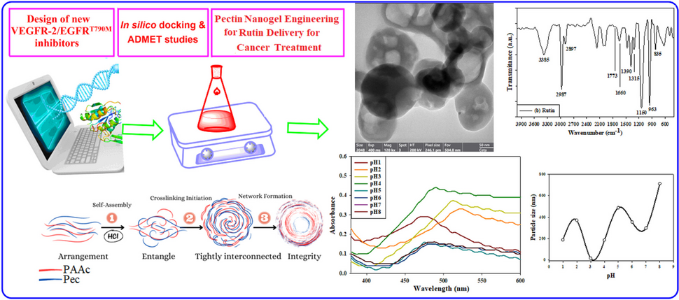 Pectin-based drug delivery systems have gained prominence in pharmaceutical applications due to their unique properties, particularly in cancer treatment. Pectin is a naturally occurring polysaccharide found in the cell walls of fruits and vegetables, known for its biodegradability, biocompatibility, and ability to form stable nanogel systems. These characteristics make pectin an excellent candidate for targeted drug delivery, as it can break down into non-toxic products within the body, minimizing long-term toxicity. Its biocompatibility ensures low immunogenicity, making it suitable for various therapeutic applications (Kedir et al. 2022). Moreover, pectin’s capacity to form nanogels enhances hydrophobic drug encapsulation and controlled release, allowing for targeted delivery to tumor sites. In parallel, the role of vascular endothelial growth factor receptor (VEGFR) and epidermal growth factor receptor (EGFR) inhibitors in cancer treatment is critical. VEGFR is essential for tumor angiogenesis forming new blood vessels that supply nutrients to tumors while EGFR is involved in cell proliferation and survival (Kapoor et al. 2024). Overexpression or mutation of EGFR is common in various cancers, making it a significant target for therapy (Karlsen et al. 2021). Dual inhibition of VEGFR and EGFR has shown therapeutic benefits by enhancing efficacy and addressing resistance mechanisms often encountered with monotherapy. This combined approach improves treatment outcomes and provides a strategic method to combat cancer’s adaptive resistance to single-agent therapies. Thus, integrating pectin-based drug delivery systems with dual VEGFR/EGFR inhibition represents a promising avenue for enhancing cancer treatment efficacy. Flavonoids, particularly rutin, have garnered attention for their potential role in cancer prevention and therapy due to their antiproliferative, antioxidant, and anti-inflammatory properties (Wang et al. 2023). Rutin, a quercetin glycoside, is known to inhibit key signaling pathways involved in tumor growth, specifically targeting vascular endothelial growth factor receptor (VEGFR) and epidermal growth factor receptor (EGFR) signaling (Nouri et al. 2020). By inhibiting VEGFR, rutin disrupts angiogenesis the formation of new blood vessels that tumors rely on for growth and metastasis thereby limiting nutrient supply to the tumor (Liskova et al. 2020). Concurrently, its action on EGFR helps to suppress cell proliferation and survival, which are critical processes in cancer progression (Wee and Wang 2017). Moreover, rutin enhances the therapeutic potential of targeted drug delivery systems by providing a dual-action mechanism against tumor growth and metastasis. This dual inhibition improves the effectiveness of cancer treatments and addresses resistance mechanisms that often limit the efficacy of single-agent therapies (Jin et al. 2023). Integrating rutin into drug delivery systems can optimize therapeutic outcomes by leveraging its natural properties to enhance bioavailability and target specificity, thereby offering a promising strategy for more effective cancer treatment (Mondal et al. 2023), complemented by explored innovative hydrogel for environmental application, demonstrating the efficacy of pH-sensitive polymer (Ghobashy et al. 2022; Abd El-Sattar et al. 2022).