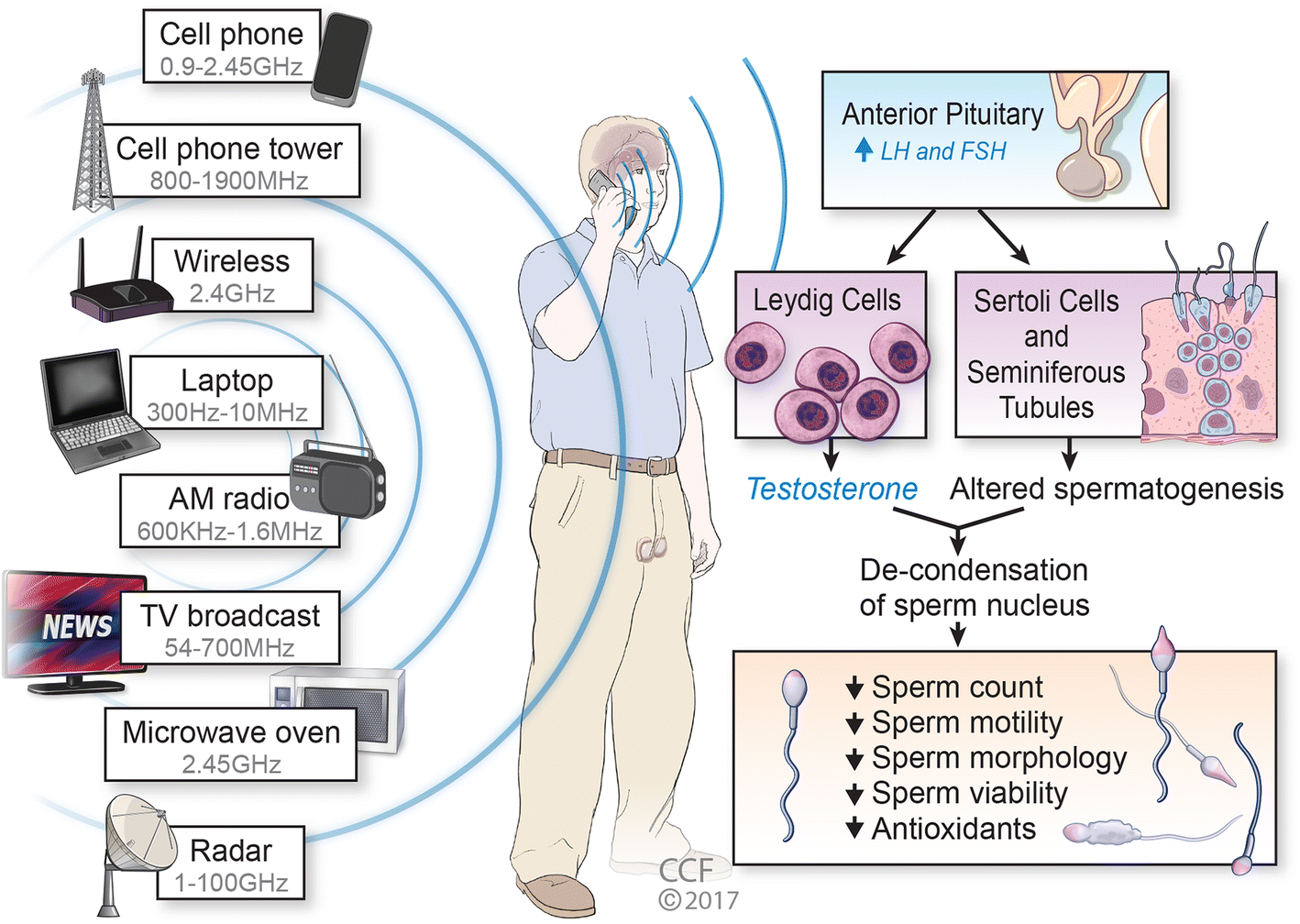 The effects of IR on reproduction are of growing concern as the number of people exposed to radiation via medical procedures and environmental exposures is significantly increasing. Data reviewed by Yousif et al. [7] obtained from 31 studies report an association between occupational exposures to IR and either the incidence of or mortality from testicular cancer. Similar data were obtained for non-ionizing radiation from 9 studies. Since radiations have a broad range of wavelengths, it is impossible to cover all the existing ionizing and non-ionizing radiations in a single article. Further, the available data on ionizing radiation clearly indicate its role in the development of cancers, such as testicular cancer. In contrast, much less clear information is available on non-ionizing radiation. Therefore, the focus of our review is more to explore the effects of non-ionizing radiation such as RF-EMF on male fertility. This includes frequencies used for cell phones, laptops, computers, microwave ovens and some other higher frequency range; this includes the RF-EMF-induced biological effects and potential mechanisms on the male reproductive system.