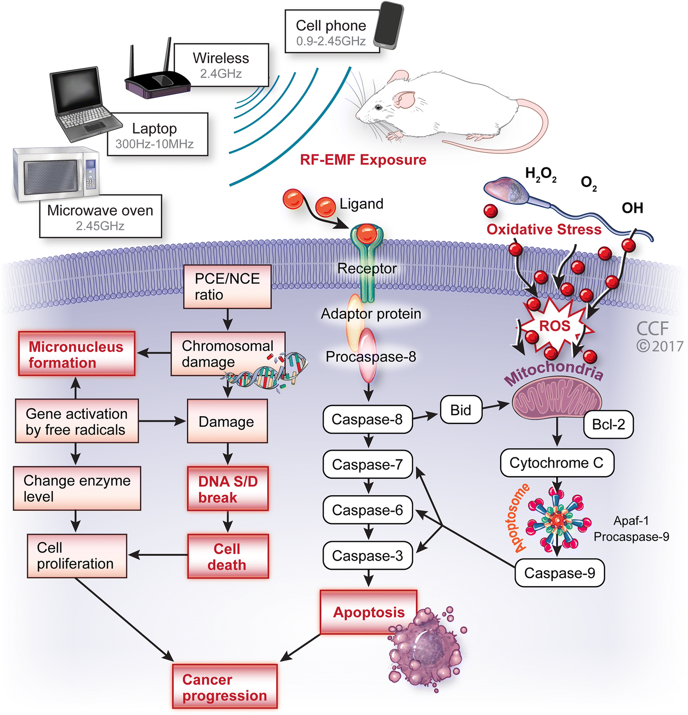 An overview on the effects of RF EMF exposure, emitting from various sources (cell phone, microwave oven, Wi-Fi, Laptop) on genotoxic parameters. The proposed mechanism suggesting radiation-induced oxidative damage may increase DNA damage, micronuclei formation and leading cancer progression. This has been linked to distorted sperm head and mitochondrial sheath in sperm tail which leads to apoptosis and finally cancer progression