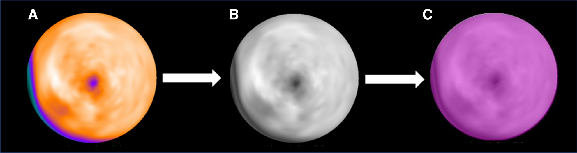 PET image processing for radiomic feature extraction. 13N-NH3 PET stress myocardial perfusion retention images represented as a left ventricular (LV) polar map (a) are converted into a grayscale lossless Portable Network Graphic (PNG) file format (b). A region of interest (purple) drawn on the whole LV (c) in for the subsequent radiomic feature extraction using LifeX software